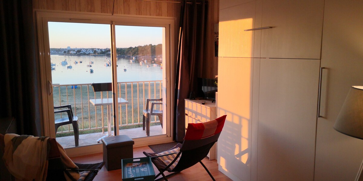 Estudio situado en el tercer piso con balcón que permite disfrutar de una vista panorámica excepcional de la entrada del puerto,el mar y la punta de Men Meur. Cómodamente instalado,asistirá en directo a la salida y llegada de los arrastreros y otros barcos. Con una ubicación ideal a 2 pasos del centro de la ciudad,donde encontrará todo lo que necesita y podrá disfrutar los martes y domingos de excelentes mercados de verano.Playa a 100 metros,bicicletas a su disposición para planificar agradables paseos.