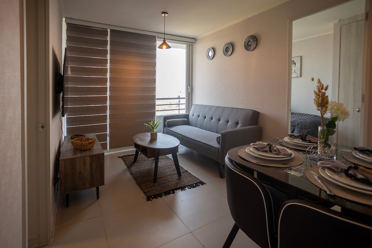 Relájate con toda la familia en este tranquilo lugar para quedarse. Moderno departamento to nuevo en piso 6 con increíble vista al centro de Santiago y los Andes. 2 habitaciones cada una con su cama y baño, ademas cuenta con 1 sillón cama, totalmente equipado para disfrutar en familia o con amigos. Relájate en un ambiente cómodo y elegante. Cerca de centros de ski para el invierno y con fácil acceso a la playa en verano. ¡Perfecto para tus vacaciones en la ciudad!