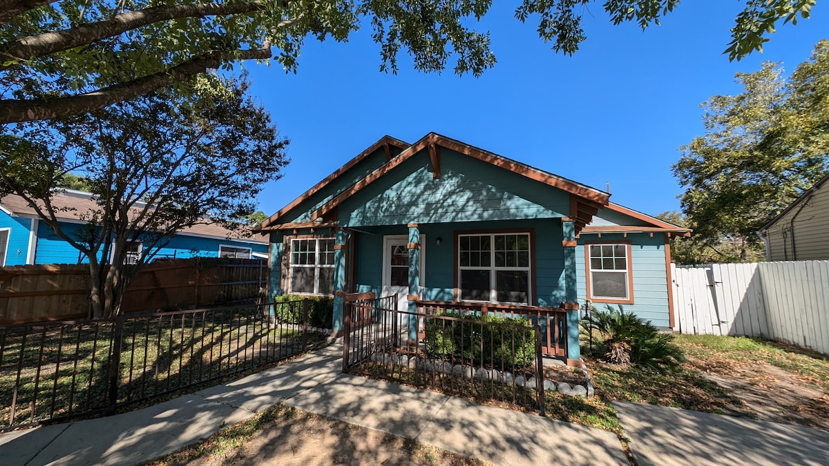 Artsy Retreat in the middle of East Austin! Spacious craftsman style bungalow. Sleeps 10. Lush front yard garden surrounded by trees and plants. Enclosed backyard ideal for your family or pets! Walking distance to Roy Guerrero Park& Greenbelt and "Secret" Beach. Quiet street with easy access to airport and freeways. Within a few miles of all major Austin attractions. Fully stocked kitchen, HVAC, 50 inch TVs, Washer & Dryer in house. Fire pit with chairs, BBQ grill and Cornhole in backyard.