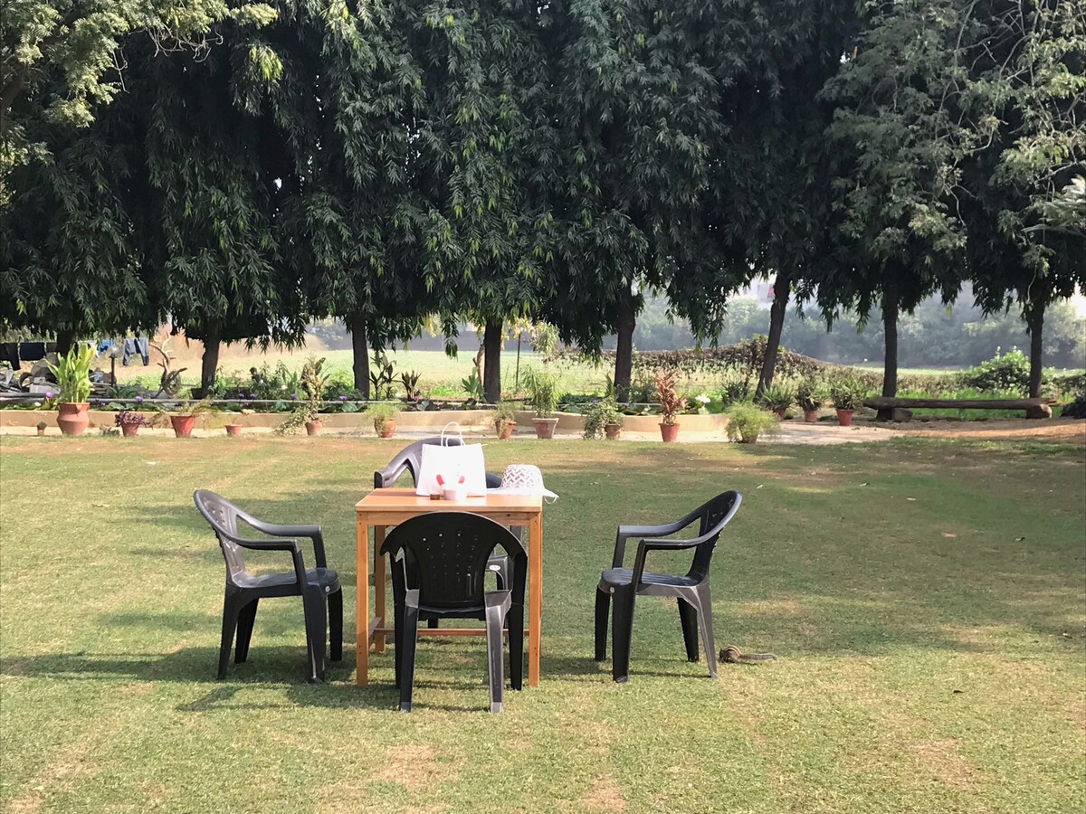 Suite en exuberante naturaleza en Gurgaon ———————————————- - Vive en una suite privada de 1 dormitorio situada en medio de 2 acres de zonas verdes en Gurgaon. Despiértate con el sonido de pájaros y ardillas jugando en tu refugio privado a solo media hora de la ciudad cibernética y a 1 km del complejo Hare Rama. Gran lugar para practicar yoga y relajarse. En temporada, solicita un thali de verduras frescas de la granja hechas en el Chula por nuestro agricultor a un costo nominal.