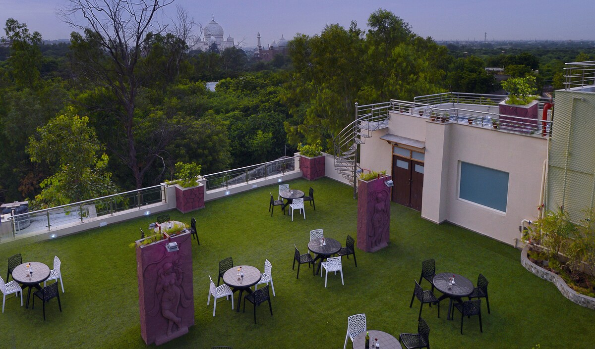 Ubicada a solo mediokm del Taj Mahal, esta habitación cuenta con una cama tamaño king o dos individuales, con una cama supletoria agregada, perfecta para un máximo de 3 huéspedes. Nuestro servicio profesional y comodidad de primera categoría te ganarán en el momento en que entres por nuestras puertas. Nuestra piscina en la azotea ofrece unas vistas impresionantes del Taj. El hotel ofrece ascensor y dos restaurantes en el lugar. Al entrar en tu habitación, serás recibido por un entorno de lujo, con una decoración elegante y comodidades prácticas. ¡Te damos la bienvenida!