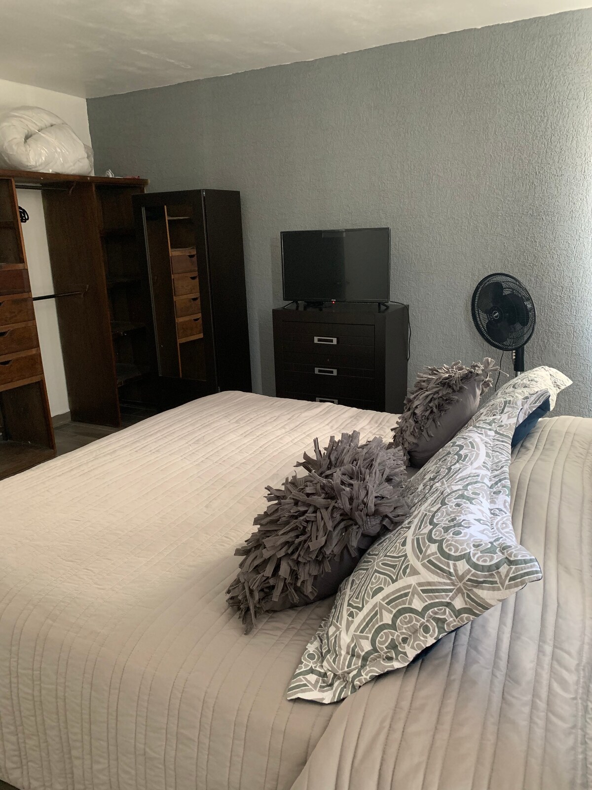 Relájate con la familia o amigos en este alojamiento cómodo y agradable. Cuenta con todo lo necesario para hacer tu estadía inolvidable. Ubicada muy cerca de avenidas principales y centros comerciales, en una zona muy segura y tranquila. Cuenta con cochera techada y patio para hacer carnes asadas. Dos habitaciones amplias con camas matrimonial y king size y un sofá cama, pantallas con Netflix activado en cada habitación y en la sala. Cocina equipada, sala, comedor y baño completo.