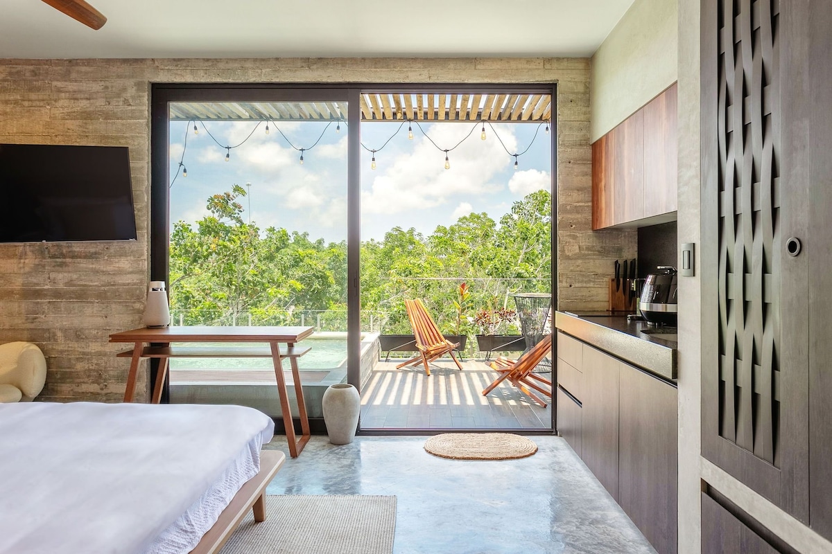 Jungle Oasis Loft w/ Private Plunge Pool & Terrace! Escape to this stylish 2nd-floor loft with a private terrace & plunge pool overlooking lush jungle views! Enjoy free bikes during your stay, a fully equipped kitchenette, and 24/7 security for peace of mind. Designed for couples, solo travelers & digital nomads, this modern retreat is cozy,quiet,and surrounded by nature just 15 min from the beach & downtown! Relax in your kingsize bed, dip in your pool,or explore nearby cenotes,beaches & more!