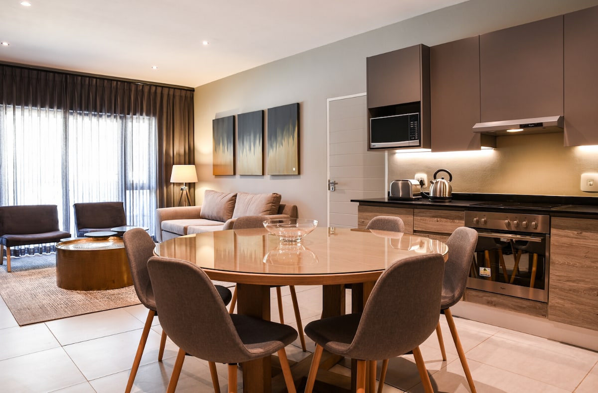 This stylish two bedroom hotel apartment is home away from home with a touch of luxury . All the services you would get during a hotel stay are also available . This luxury apartment offers room service. The is also a bar downstairs, a restaurant, a gym and a spar downstairs. Sandton City and Mandela Square is a 5 minutes walk from the hotel.