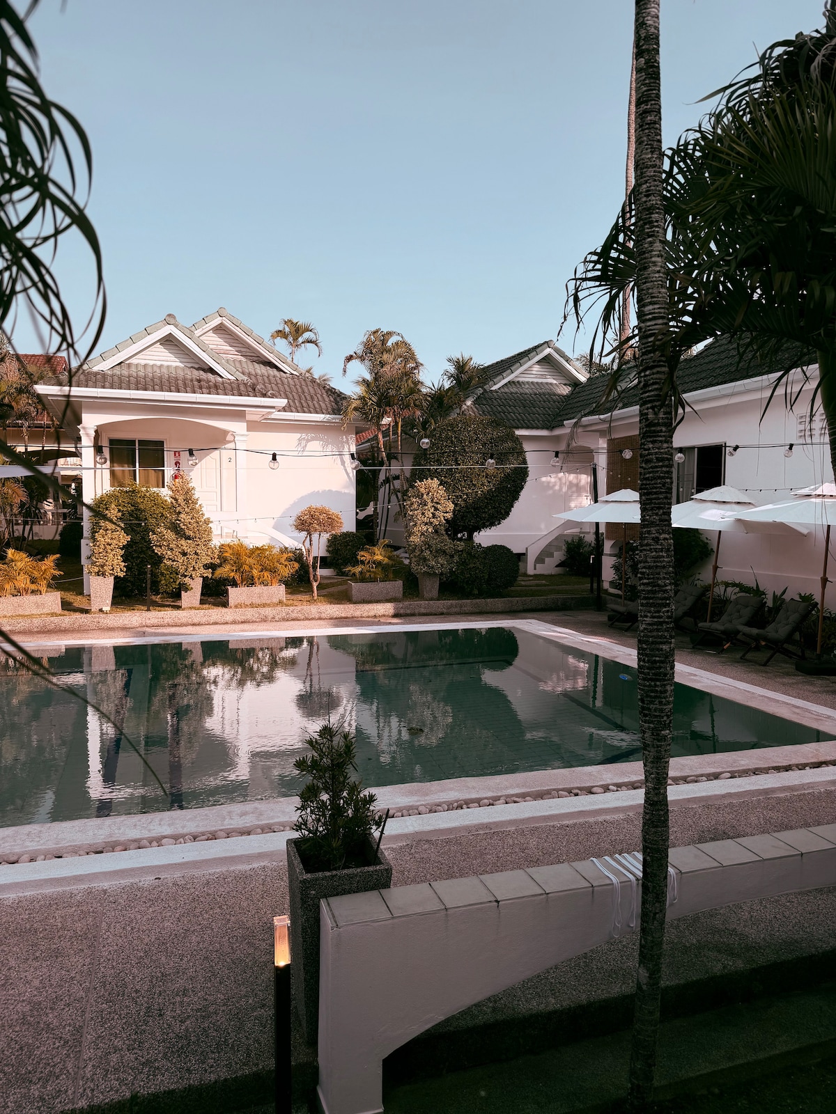 Nuestra pequeña residencia privada (no un hotel) con 4 bungalows y 3 apartamentos está ubicada en un lugar tranquilo lejos de las calles ruidosas. Todas las unidades tienen una terraza de 10 m² con vistas a un jardín cuidadosamente diseñado con una pequeña piscina compartida (aproximadamente 7 m x 5 m). No se admiten niños. Aprox. 1200 m (16 minutos a pie) de ChaoFah Road, aprox. 1400 m (18 minutos a pie) de Palai Beach (no apto para nadar). No hay bares muy cerca.