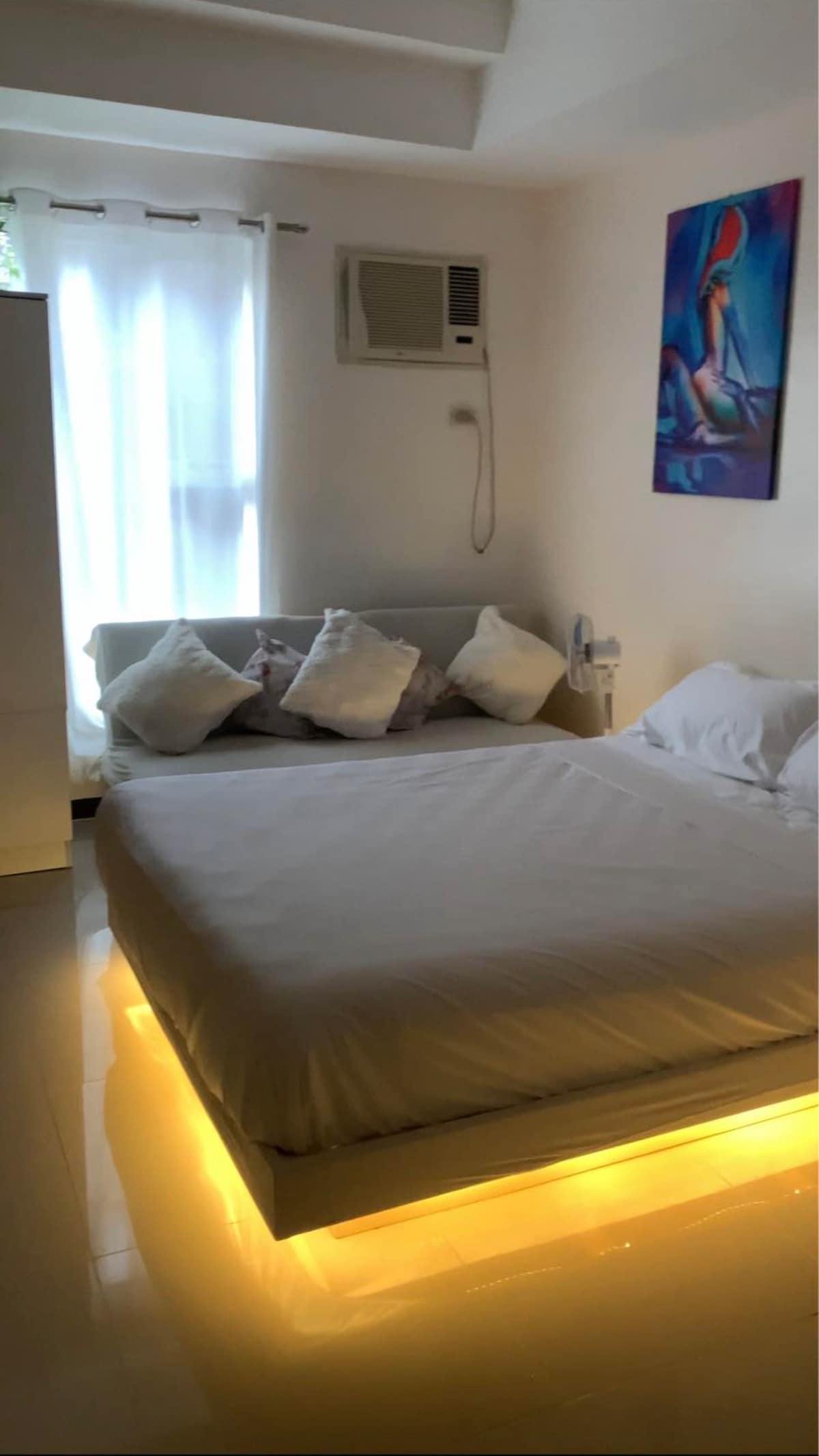 Una gran unidad de esquina de 62 metros cuadrados con aire acondicionado, estratégicamente ubicada en una carretera principal con balcón que se abre a la piscina. El lugar está a pocos pasos del hipermercado SM para todas tus necesidades y comestibles, así como tendrás un Cocina bien equipada. Puedes aparcar directamente debajo de tu alojamiento con Aparcamiento gratuito en el sótano. Disfruta de acceso ilimitado a la piscina y al gimnasio. La ducha tiene agua caliente, Internet es de 200 Mbps, puedes ver todos tus programas en 4k en el gran televisor inteligente.