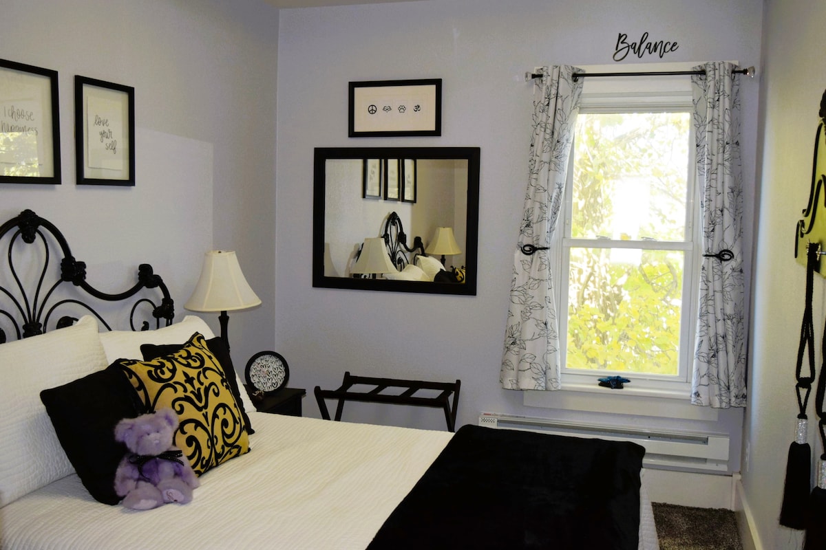 Alegre dormitorio recién remodelado con 1 cama tamaño queen.