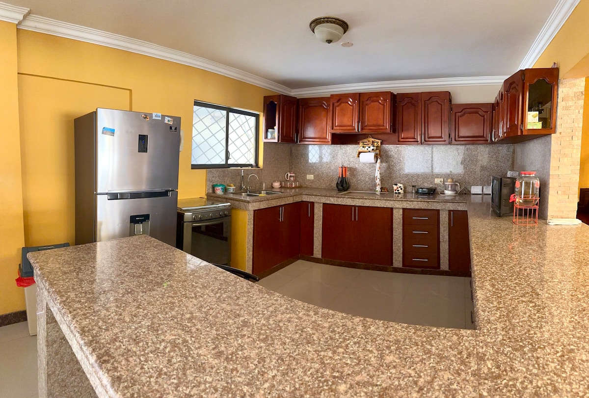 Departamento amplio, buena ubicación, cerca de la zona comercial (mercado central, bancos, panaderias, farmacias). Dos habitaciones, cuarto master cama de dos plazas con aire acondicionado, segundo cuarto, cama de dos plazas, tercer cuarto cama de 1 plaza y media, los 3 con closet y AC. Cocina amplia y grande completa, AC en la sala, comodo comedor y vista al centro de la ciudad. Cuenta con wifi y lavanderia.