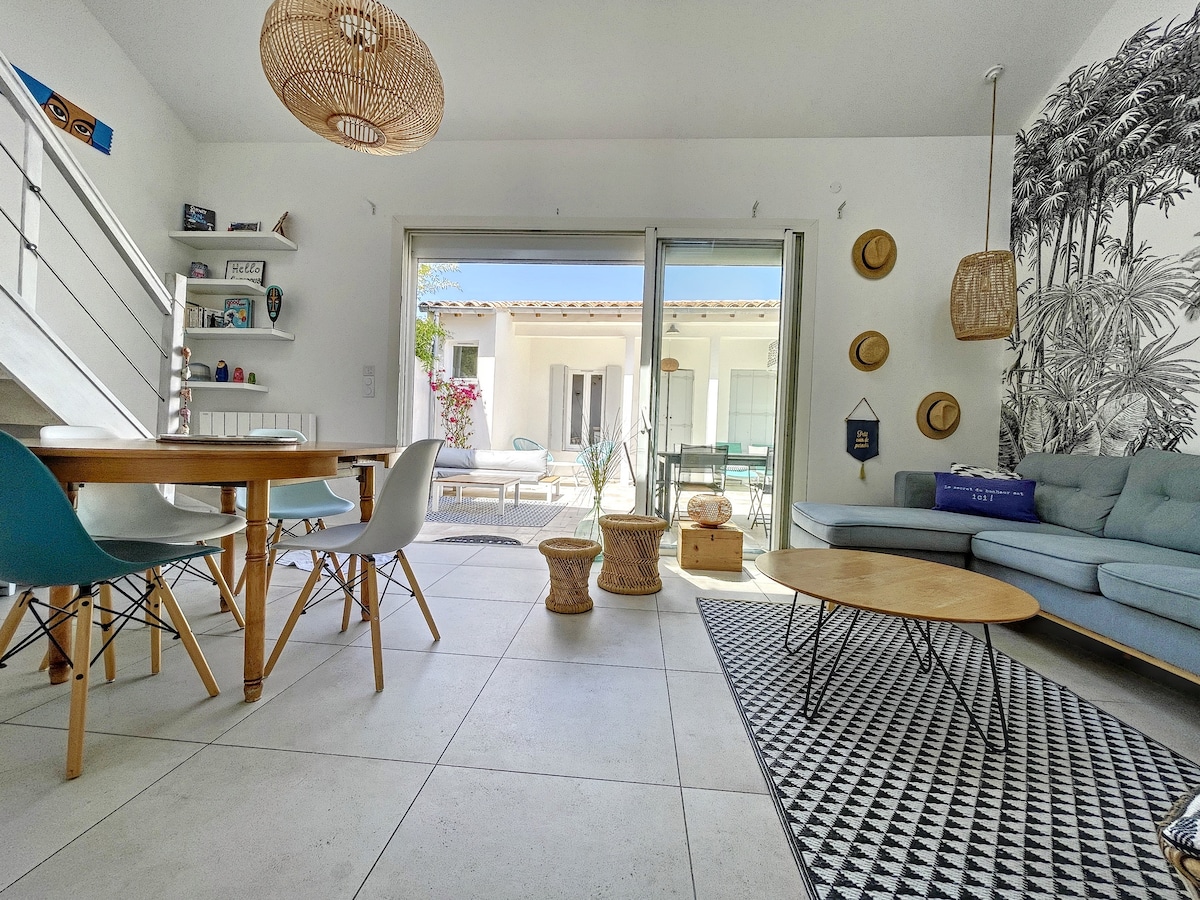 En el corazón de Palavas, auténtica casa de pescadores situada a 5 minutos a pie de las hermosas playas y del centro. Llena de encanto, nuestra casa ha conservado su alma al tiempo que ofrece el máximo confort y un ambiente de "vacaciones" típico del paseo marítimo. Ofrece 2 alojamientos reunidos alrededor del patio en una sabia mezcla de lo antiguo y lo moderno, hermosos volúmenes, un ambiente "acogedor", buenas prestaciones: 8 camas, cocina equipada, 2 baños, 3 dormitorios en planta baja y uno en el altillo.