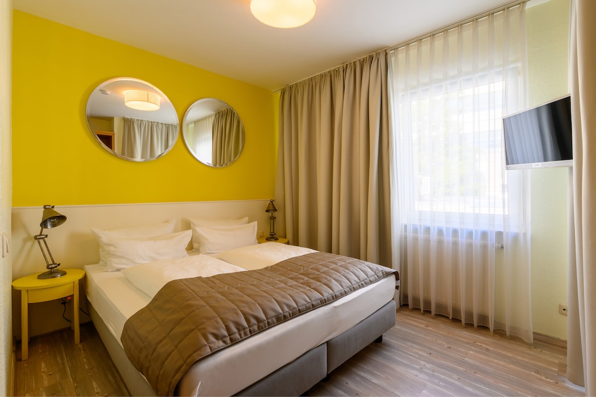 Welcome to Ruby Leni, where laidback vibes meet Düsseldorf’s rich theatre history. Our charming Nest Room (14-16m²) is perfect for a short solo stay or a snug retreat for two. The 160cm-wide, extra-long bed with luxurious oversized bedding ensures restful sleep. Enjoy supersilent air conditioning, fast WiFi, a Marshall amp, and a refreshing rain shower with Ruby Care aromatherapy products. City tax is included in the price.