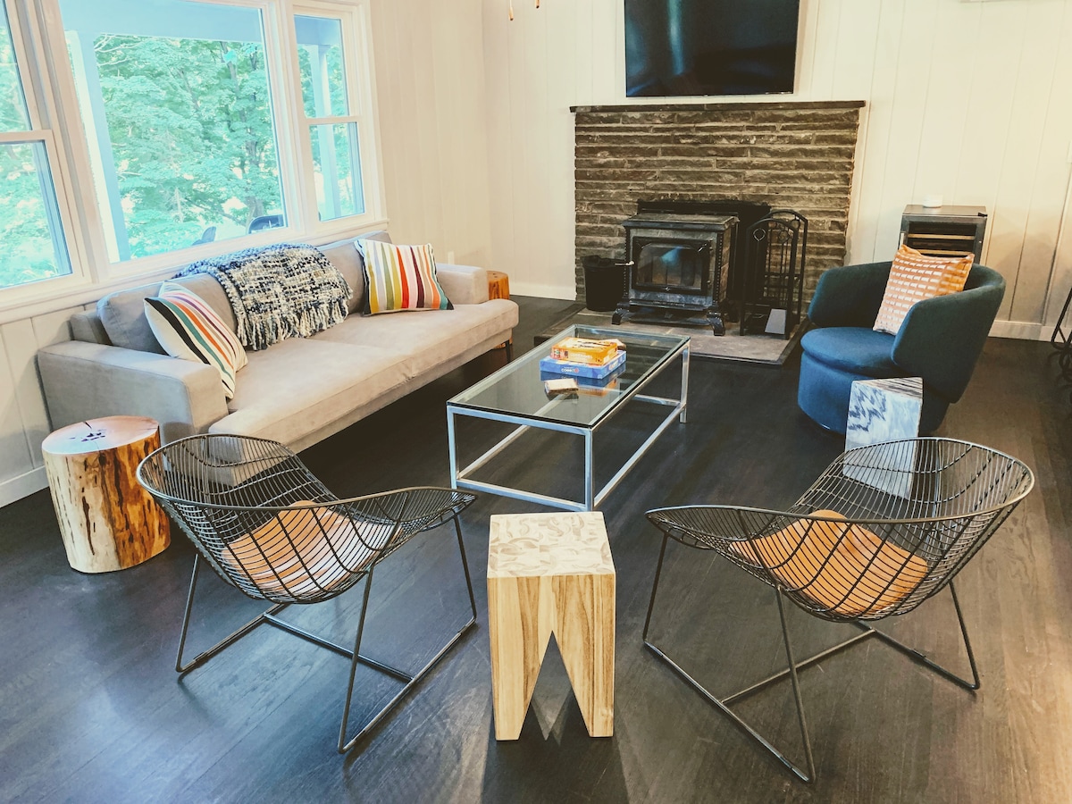 This designer cabin blends natural materials and modern finishes. — sophisticated & cozy. Gaze at (or swim in!) the stunning spring-fed pond steps from the house. Lounge on the deck or enjoy coffee in the sunroom. The interiors feature three bedrooms, two full bathrooms, living room with chic and cozy furniture and wood burning fireplace, and fully appointed kitchen that's a joy to cook in. Entertain your family & friends at the table for 10 and continue out to the grounds, beverage in hand.