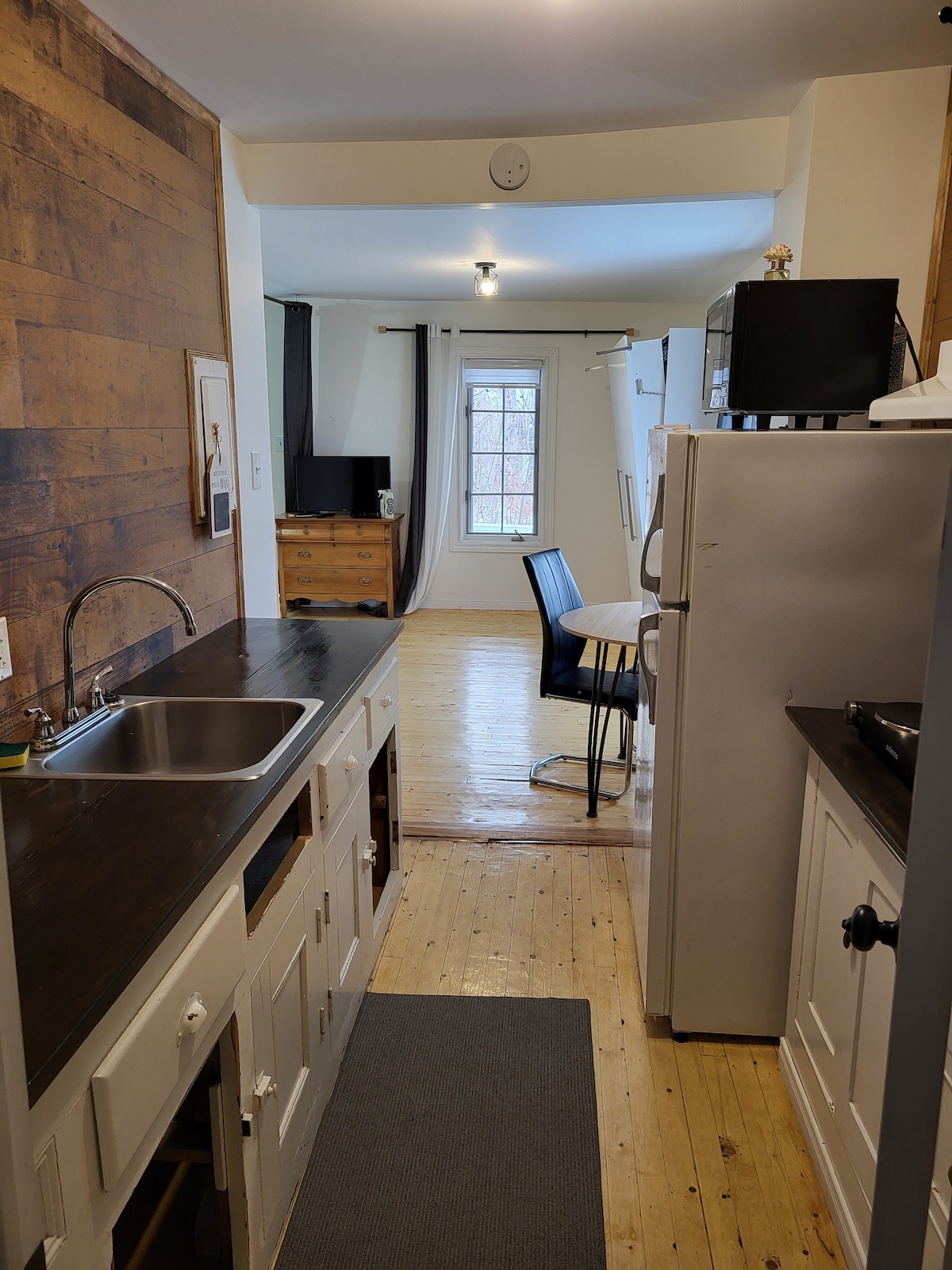 Su pie en tierra en Matane se encuentra en el centro de la ciudad., cerca del río y el río. es un bonito estudio luminoso a estrenar con lo necesario para cocinar: nevera, placa de inducción de 2 fuegos , horno de convección portátil de gran capacidad, así como todas las comodidades. Una cama queen, espacio de trabajo con wifi de alta velocidad y un televisor inteligente. En temporada tiene acceso a la barbacoa, al patio trasero y a la chimenea exterior.