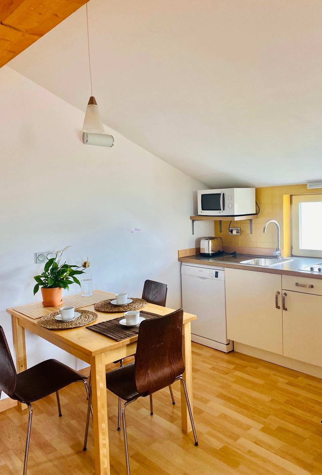Apartamento La mar salada ideal para 4 personas con 2 habitaciones con cama de 1,50 x 2 metros. Cocina con vitrocerámica de 4 fuegos con menaje para cuatro personas con nevera, microondas y tostador de pan. Porche en la salida directa al jardín con mobiliario de jardín con mesa y sillas. Baños completos con bañera y bidet. Los baños disponen de toallas y gel de ducha para hacer más cómoda la estancia.