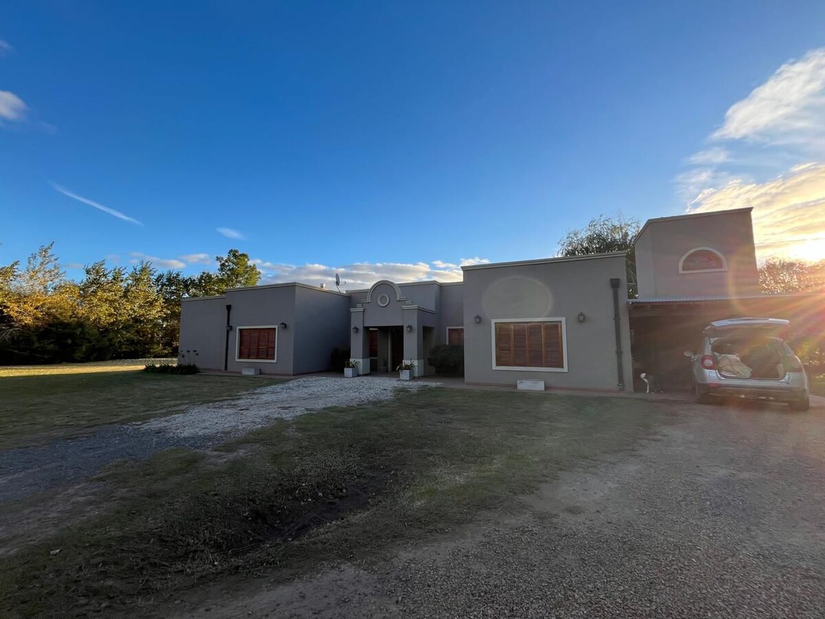 Relajate con toda la familia en esta acogedora casa quinta ubicada en las afueras de Navarro, Buenos Aires, con toda la tranquilidad del campo. Con capacidad para 8 personas -4 habitaciones amplias, una en suite - 3 baños completos + 1 toilette - Gran living para compartir en grupo - Cocina-comedor equipada con todo lo necesario - Parrilla techada y galería para asados al aire libre - Pileta -Parque de 4000 m² con mesas y arboles - Ropa de cama incluida - WiFi - Estacionamiento para 2 autos