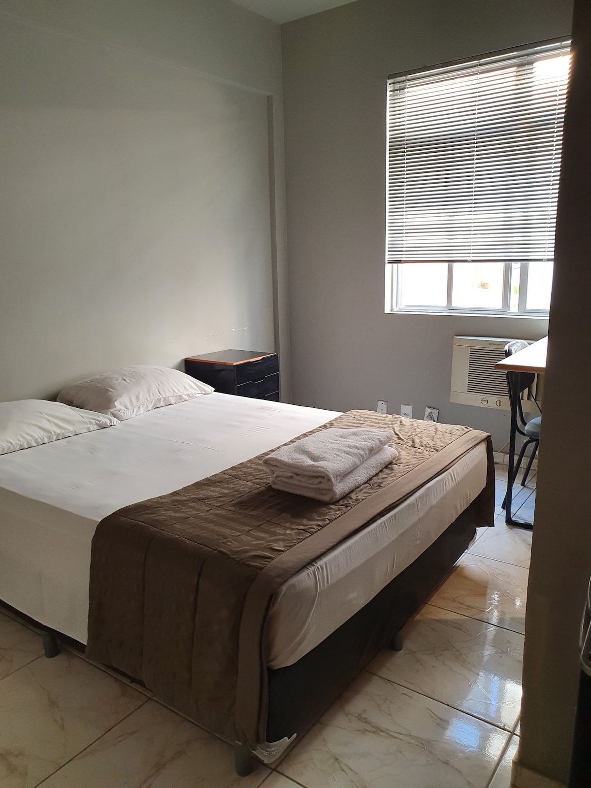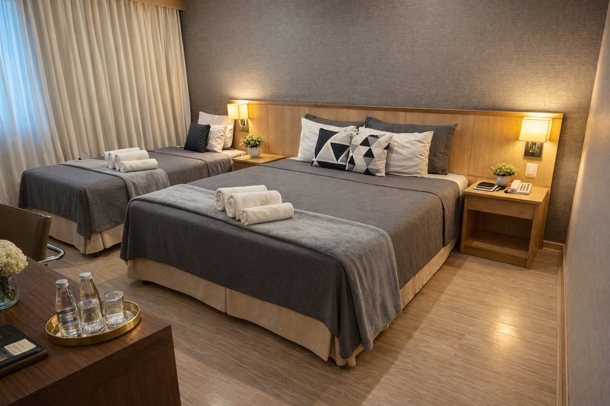 49m2, cómodo, moderno y cerca de los principales eventos como Rock in Rio, parque olímpico y Riocentro. Total privacidad para dos personas con cama doble Queen, que puede incluir un tercer huésped bajo petición. Contamos con una excelente infraestructura, recepción 24 horas, desayuno, restaurante, lavandería, piscina, hidromasaje, estacionamiento gratuito, etc. junto a Map Band Shopping (Mc Donalds, Lojas Americanas, Farmacia, Bancos y otros comercios). Playas de Barra y Recreio a 20 minutos en coche.