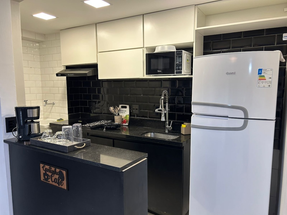 Piso elegante y confortable con todas las comodidades de un hotel. Ideal para familias y viajeros de negocios, ofrece habitación con cama queen, sala con sofá cama, aire acondicionado, Wi-Fi, TV por cable y cocina compacta equipada con heladera y microondas. El condominio cuenta con gimnasio, piscina, sauna, jacuzzi y restaurante con comidas a precios asequibles. Ubicado a solo 100 metros del RioCentro y cerca del Farmasi Arena, el apartamento combina comodidad, practicidad y excelente ubicación en Barra da Tijuca.
