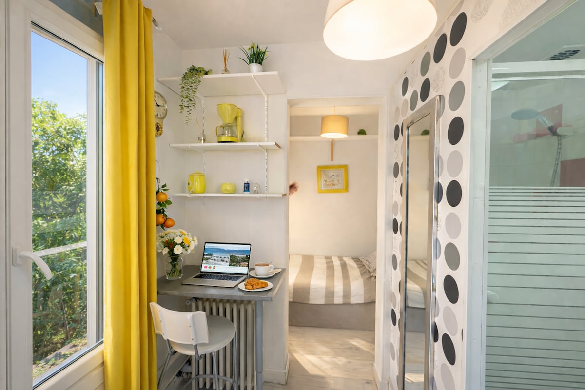Estudio de 14 m2 totalmente equipado y completamente independiente en el jardín de la residencia privada que incluye: una cocina equipada con zona de comedor (placa de inducción, nevera/congelador, hervidor de agua, cafetera con cápsulas, microondas y utensilios de cocina), una cama para dos personas, una ducha, un inodoro, un lavabo, una televisión y wifi de buena velocidad gracias a un adaptador. El estudio tiene calefacción, y las sábanas y toallas están incluidas. El aparcamiento es gratuito en la calle tranquila e iluminada.
