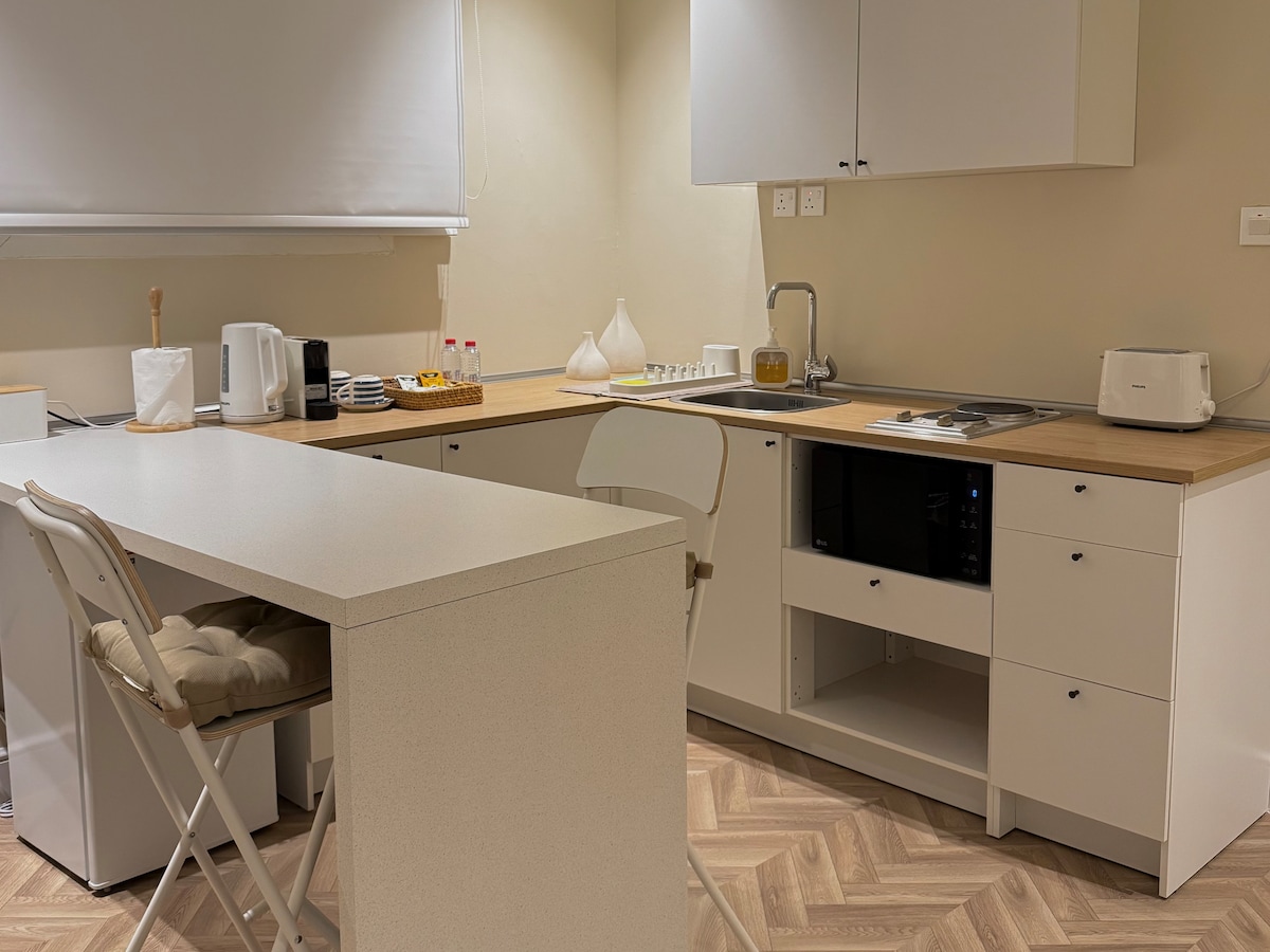 Un estudio tranquilo y elegante con registro de entrada autónomo, que consta de una cama principal, un asiento lateral y un televisor inteligente, además de un rincón de café para hacer café y té, un hervidor y un microondas, y un baño completo con artículos de ducha. Este estudio está estratégicamente situado en el norte de Riad y está cerca de todos los servicios y eventos. No hay wifi. Riyadh Boulevard está a 5 minutos Walnder Gunn a 8 minutos , El aeropuerto está a 18 minutos.