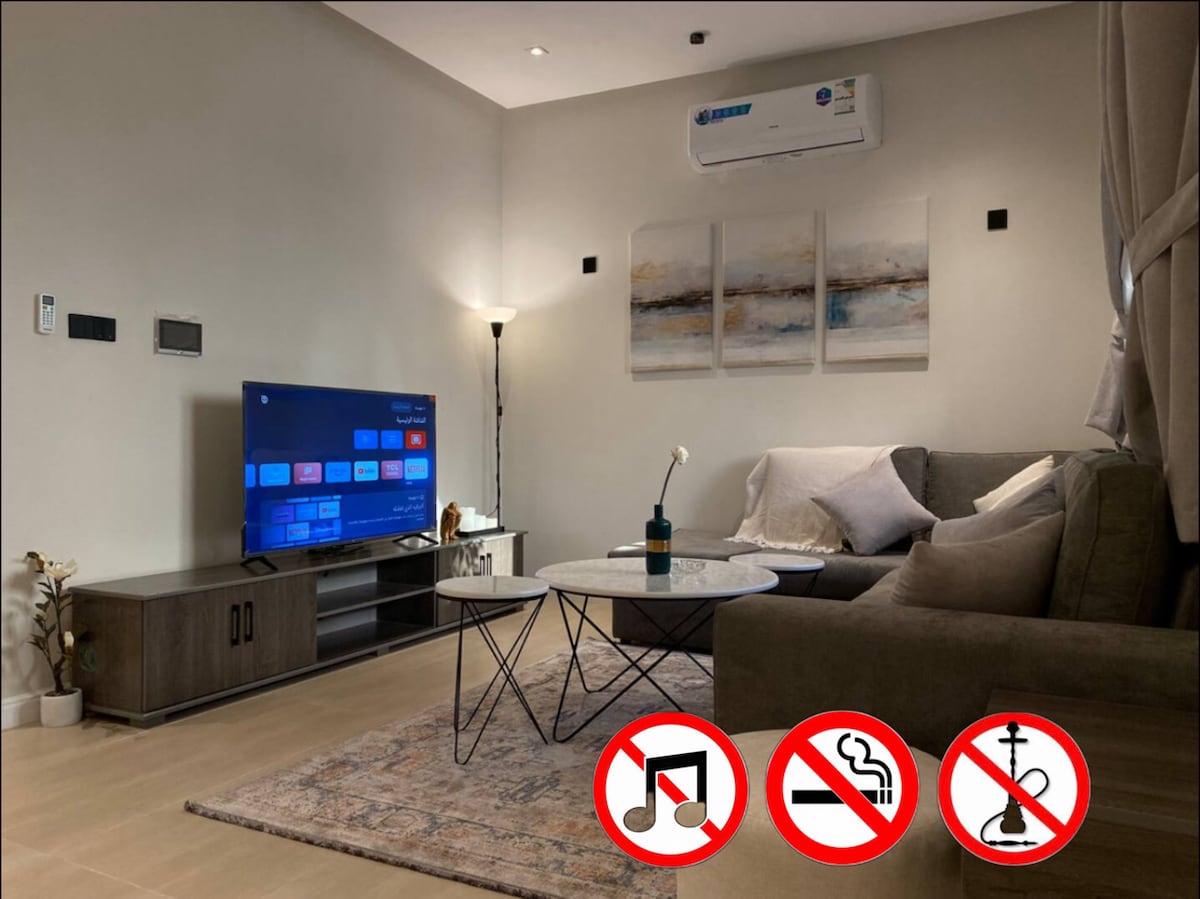 Nueva suite de lujo con bañera y zona de estar en un lugar tranquilo. • Auto check-in • Bañera • Zona de estar extra • WiFi • Colchón médico • Sofá cómodo premium • Parking en superficie • Amenidades de hotel • Cocina equipada • Lavadora • Ubicación: céntrica, a 1 km del Anillo Norte; 12 min aeropuerto; 15 min Distrito Financiero; 15–20 min Riyadh Season y Boulevard; 10–15 min Univ. Imam, Princess Nourah y SEU. • Nota: limpieza diaria estilo hotel en horarios convenientes.