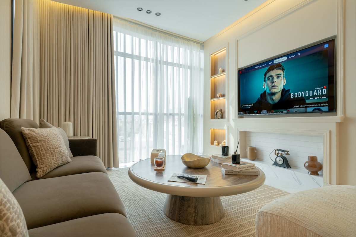 Departamento de lujo de 2 habitaciones con jacuzzi privado en la azotea en Al Malqa, al norte de Riad. Disfrute de una estancia con estilo que incluye un televisor inteligente QLED de 75 pulgadas con Netflix, Disney+, Shahid y OSN. La azotea ofrece una hermosa vista, asientos al aire libre y un sistema de niebla refrescante para crear un ambiente agradable. Wifi de fibra de alta velocidad, cafetera, horno eléctrico y registro de entrada autónomo. Ideal para parejas y para noches relajantes en la azotea.