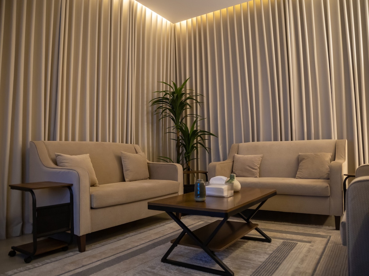 Modern 1BR in Hittin, one of Riyadh’s prime locations, minutes from Boulevard City and top cafes. Designed for comfort and ease with self check-in and a full smart system. Features a cozy living area, comfortable bedroom, 85” Smart TV, and an elegant electric fireplace for a relaxing atmosphere. Fully equipped kitchen with oven, microwave, electric stove, dishwasher, and washing machine. Clean, stylish, and ideal for couples, business travelers, and short or extended stays.
