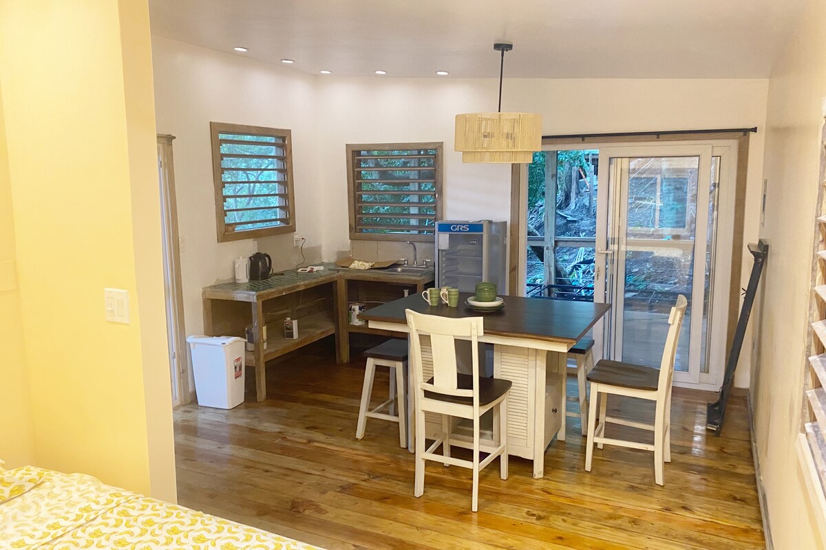 Fabuloso estudio Jellyfish con cama tamaño king. Cuenta con una hermosa terraza privada elevada con mesa de comedor y hamaca. El gran baño de azulejos personalizados cuenta con una ducha para 2 personas. La cocina completa tiene todo lo necesario (incluso licuadora y cafetera). Hay una sala de estar con un cómodo sofá y TV de pantalla plana. Disfruta de las vistas de nuestra hermosa propiedad tropical desde todas las ventanas. La propiedad cuenta con dos piscinas con vistas al mar, muelle, playa y una cocina al aire libre para que todos los huéspedes disfruten.