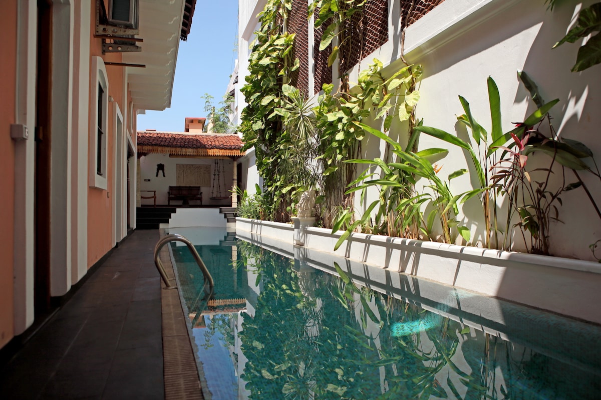 La Plage es un alojamiento de lujo a solo 100 metros (3 minutos a pie) de la playa de Pondicherry y al lado de White Town🏖️. Sumérgete en un relajante jacuzzi privado 🛁 para 2 personas, una barra de ónix brillante🧱, un proyector de 🎬 120" con sonido Dolby, wifi de 🌐 1000 Mbps y 18 aplicaciones OTT como Netflix📺. Relájate en el 🌿 sereno jardín del patio trasero, ideal para niños y tranquilo. A solo 8 minutos (550 m) del Sri Aurobindo Ashram🕉️. Perfecto para escapadas románticas, amantes de la playa y noches de cine. ¡Tu escapada a Pondy te espera! Una joya escondida en el corazón de Pondy