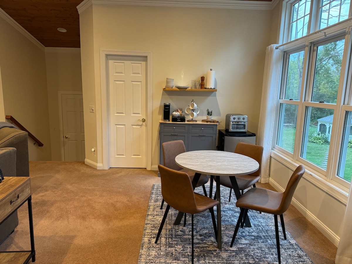 Suite privada bellamente decorada, completamente separada, adjunta a una casa unifamiliar. -1 dormitorio con cama tamaño Queen. -1 baño de 3/4 - Sala de estar con TV inteligente de alta definición de 55 pulgadas. - Cocina completa con mesa de comedor - Lavadora y secadora apiladas para lavar la ropa. -1 garaje para autos El garaje para un automóvil solo es adecuado para vehículos compactos; los vehículos más grandes tendrán un espacio limitado. Los garajes no tienen calefacción y estarán fríos de septiembre a mayo.