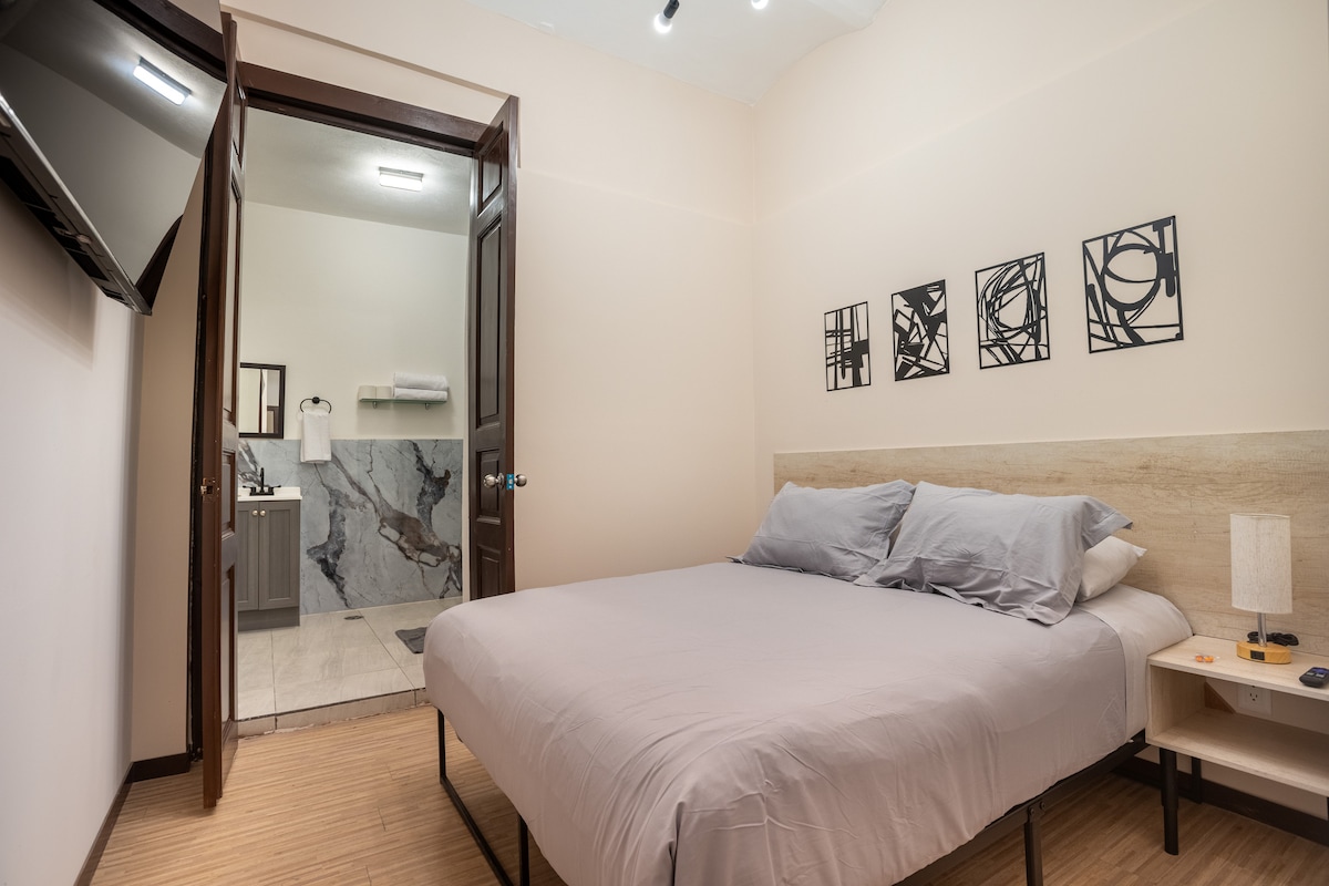 Departamento situado en el segundo nivel de un elegante edificio porfiriano, en una de las mejores zonas de la ciudad: Roma Norte. Fusiona con gracia el estilo contemporáneo y clásico. Dispone de una amplia habitación con una cómoda cama King-size, aire acondiocioado, un escritorio ideal para trabajar, Tv y un frigobar. También encontrarás un espacio perfecto para guardar tus pertenencias. Por último, un amplio baño que incluye regadera, wc, lavamanos y una clásica tina perfecta para relajarse.