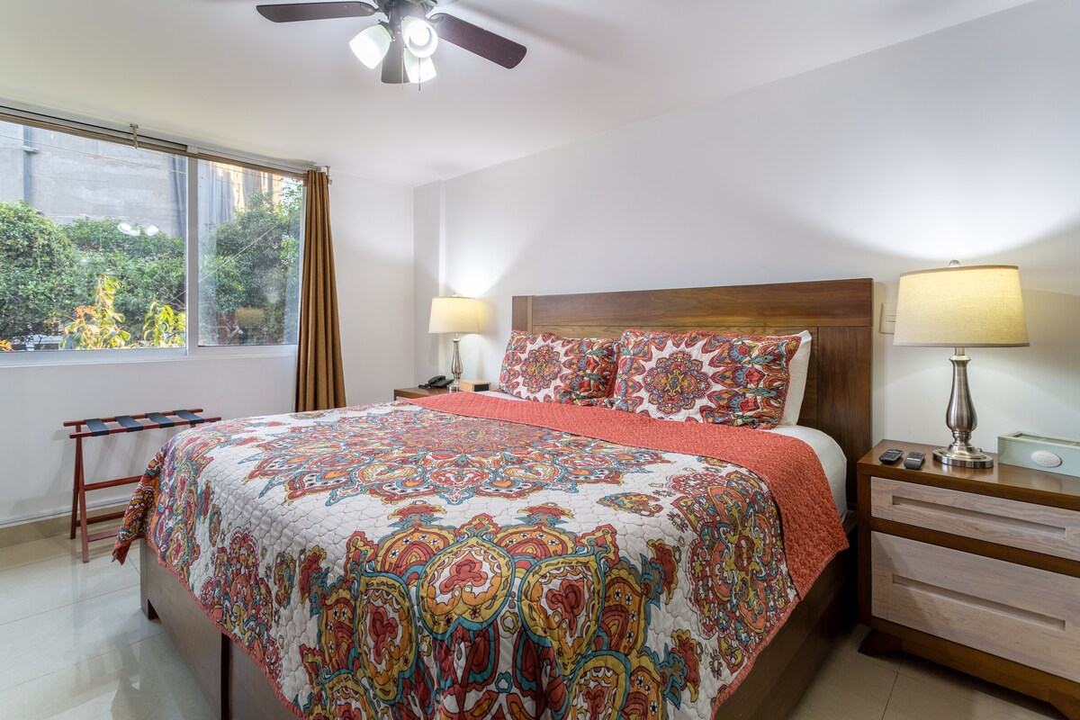 Disfruta de un mezcal entre plantas de la selva en una colorida terraza de azulejos. Honrando el encanto de los años 50 del edificio, esta divertida casa retro-chic alberga piezas de diseño de todo México. Los cojines brillantes, el papel pintado tropical y una nevera verde menta acaparan toda la atención. El café y el desayuno de cortesía te prepararán para explorar el barrio y la ciudad, mientras que el escritorio frente al patio interior del edificio será el lugar perfecto para trabajar de forma remota. Hemos creado un lugar de buen gusto, acogedor y cómodo para que tu estancia en la ciudad sea una experiencia completa. ¡Encontrarás muchas artesanías y piezas de arte de diferentes regiones de México! Servimos café y todos los elementos esenciales del desayuno que puedes disfrutar en el rincón del desayuno en el interior o en la mesa del comedor de la terraza de la azotea. La cama tamaño queen supercómoda y las bonitas sábanas te asegurarán un buen descanso nocturno, preparándote para el día siguiente en esta ciudad extraordinaria. El escritorio del dormitorio es un lugar ideal para trabajar o planificar el día siguiente, con vistas al patio interior del edificio. Cocina totalmente equipada con todos los elementos esenciales y extras para que la disfrutes. Cómodo baño con ducha de lluvia de buena presión y agua caliente. La mejor característica del apartamento es su gran azotea privada, totalmente amueblada con zona de estar y comedor, y cama de salón para tumbarse después de un ajetreado día explorando la ciudad. También es perfecta para disfrutar del amanecer y el atardecer de la ciudad. ¡Estarás rodeado de árboles e incluso tendrás vistas al castillo de Chapultepec! Se ofrecen servicios adicionales que se pueden organizar después de que se confirme la reserva. Estos incluyen: servicio de limpieza diario, lavandería y limpieza en seco, preparación de comidas, conductor y otros. ¡Solo tienes que decirnos cuáles son tus necesidades y nos aseguraremos de satisfacerlas! Estarás en un apartamento único y cómodo ubicado en una de las zonas privilegiadas de esta ciudad, justo donde Condesa se encuentra con Roma, rodeado de los principales accesos de transporte. Los huéspedes podrán acceder al apartamento completo, al que se accede por una entrada privada. Esta entrada conduce a ambos apartamentos que tenemos, por lo que la compartirás con otros huéspedes de Airbnb. Tener una entrada privada y una escalera, con llegada autónoma y puerta de entrada sin llave, dará a los huéspedes más privacidad y comodidad durante su estancia. Los horarios de llegada y salida se acordarán previamente. Siempre somos flexibles, tratando de adaptarnos a los horarios de llegada y salida de los huéspedes. Nuestra guía de la ciudad se hizo con mucho amor, compartiendo nuestros lugares favoritos y más valorados de la ciudad. Y siempre estamos disponibles para cualquier pregunta o ayuda que los huéspedes puedan necesitar durante su estancia. Con sus calles arboladas, dos parques y los mejores bares y restaurantes, la colonia Condesa, o «La Condesa», es uno de los barrios más populares y encantadores de la ciudad. El Castillo de Chapultepec, el Paseo de la Reforma y el metro Chapultepec están a un paso de distancia. Caminar es la mejor opción, especialmente porque hay mucho que ver y explorar en Condesa y otros barrios cercanos, como Roma. Todo el transporte público principal está a solo una manzana de distancia. La línea de metro que para aquí, la parada de Chapultepec, te lleva directamente al centro de la ciudad. Si prefieres viajar en coche, Uber es siempre la opción más eficiente y bastante barata. También contamos con un gran conductor de confianza que ofrece servicios de transporte a lugares como Teotihuacán, donde se pueden ver las magníficas Pirámides del Sol y la Luna.
