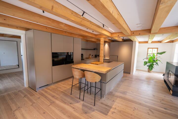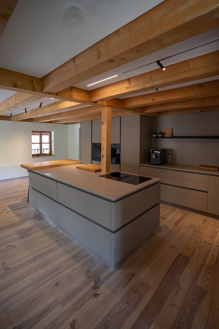 Disfruta de una relajación con estilo en medio de la naturaleza: nuestro modernizado Albuch Chalet Haus está situado en un lugar idílico en el borde del bosque de Treffelhausen (Böhmenkirch) en la Jura de Suabia. La casa de diseño de 225 m² en construcción sostenible de madera Thoma ofrece un confort de vida excepcional para hasta 8 personas, ideal para vacaciones familiares, descansos relajantes con amigos o momentos especiales juntos en un entorno tranquilo.