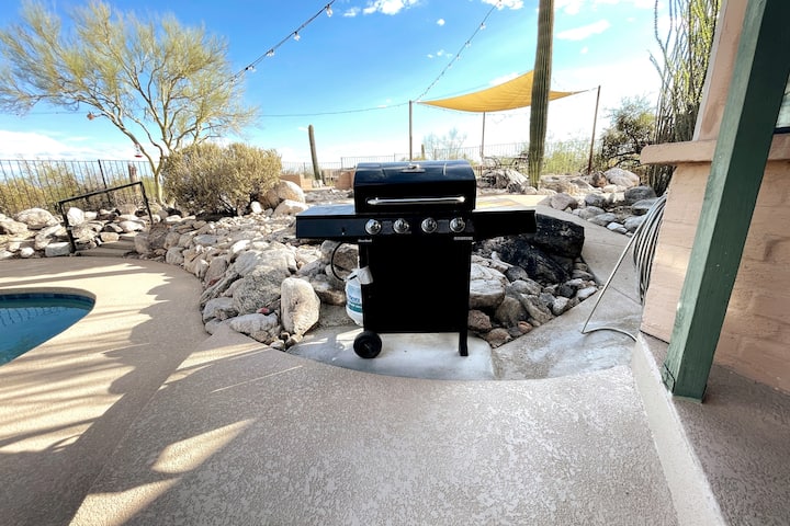 La Piscina: Nuestra piscina privada está rodeada de impresionantes vistas del desierto y la ciudad, garantizando privacidad y tranquilidad. Disfrute de las sillas de descanso, haga una parrillada en la parrilla y tome el sol. ¿Necesita que la piscina esté climatizada durante el invierno? Ofrecemos este servicio por un cargo adicional de $60 por noche. ¡No necesita traer juguetes de piscina ni toallas, nosotros nos encargamos de todo!