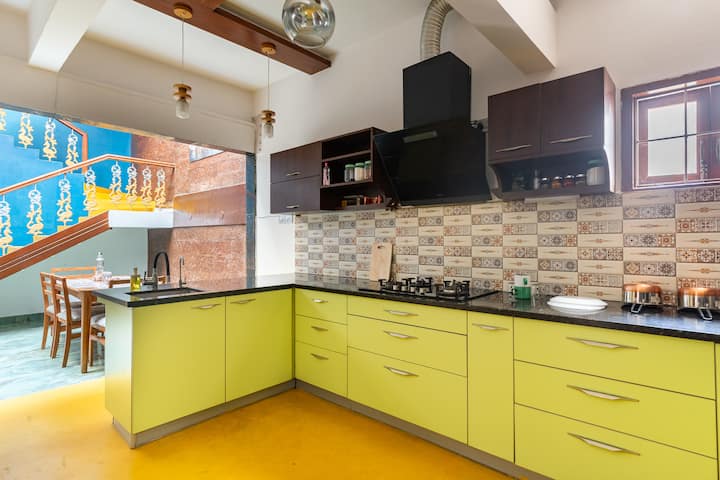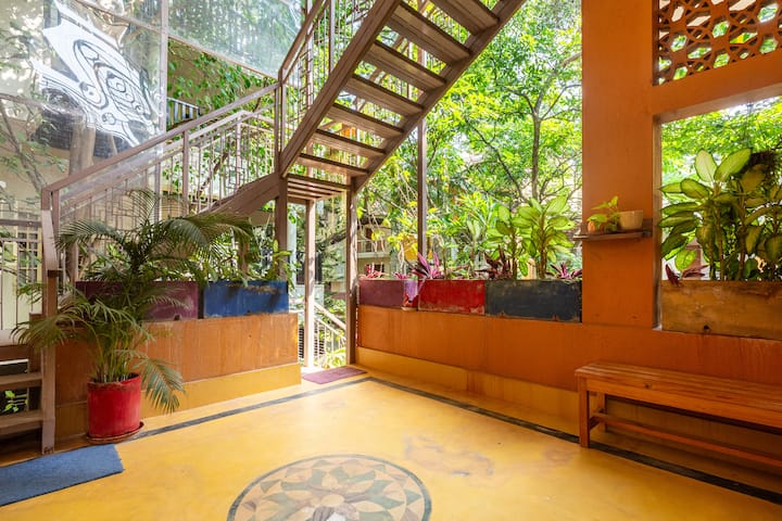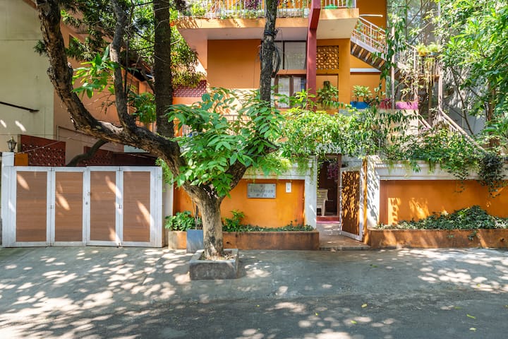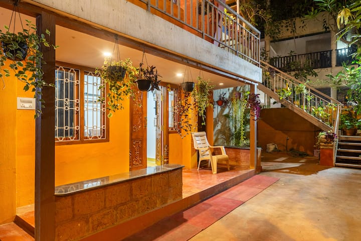 Ubicado justo detrás de Just Loaf en 80 Feet Road, este bungalow dúplex 4BHK ofrece una escapada serena en medio de la energía vibrante de Koramangala 4th Block. Diseñado para familias, fundadores, creativos y equipos remotos, Tranquillo es un refugio donde la amplitud se encuentra con la quietud y la naturaleza se entrelaza con la comodidad moderna.