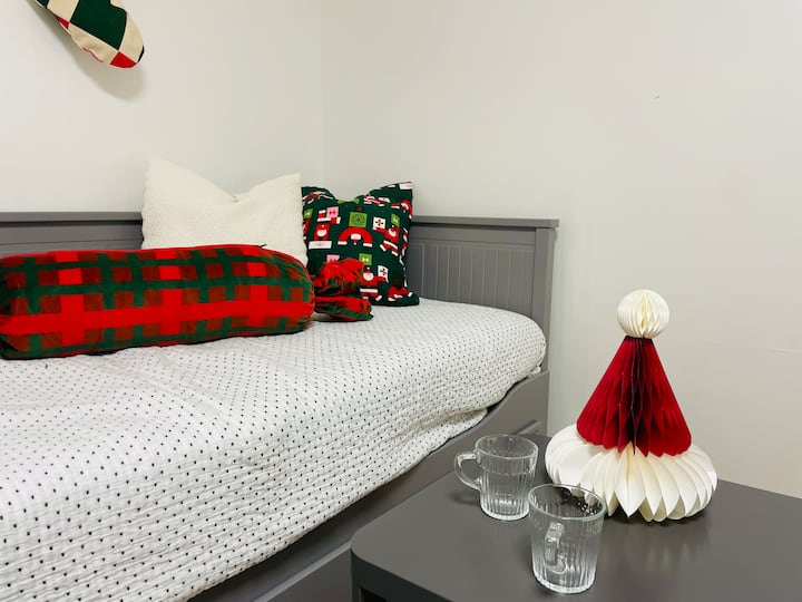 Es un dormitorio espacioso con 1 cómoda y espaciosa cama tamaño queen y 1 sofá cama (cama para 2 personas cuando se extiende). Puedes pasar un rato relajante con amigos o familiares mientras ves la televisión, o incluso una habitación acogedora.