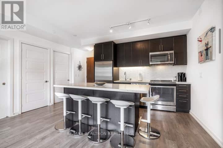 Las comidas en el apartamento son cómodas de preparar, servir y limpiar. La isla tiene 5 taburetes para los huéspedes que también son un lugar estupendo para pasar el rato y socializar. La cocina está equipada con platos, cuencos, vasos, tazas de café, cubiertos y utensilios de cocina, todo nuevo.