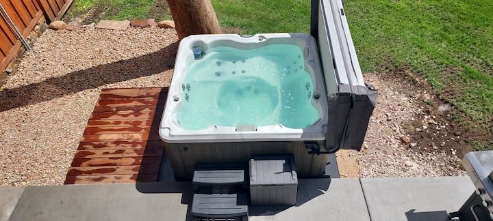 *EXTERIOR: dirígete desde la cocina a nuestra nueva zona exterior con la nueva bañera de hidromasaje, parrilla de barbacoa (propano GRATIS), 2 mesas de picnic, 1 mesa de servicio y 4 sillas de exterior. Sube las escaleras hasta la cubierta Trex de estilo calicó que envuelve el gran pino. Disfruta de una lujosa zona de estar y una chimenea de propano y crea recuerdos con familiares y amigos.