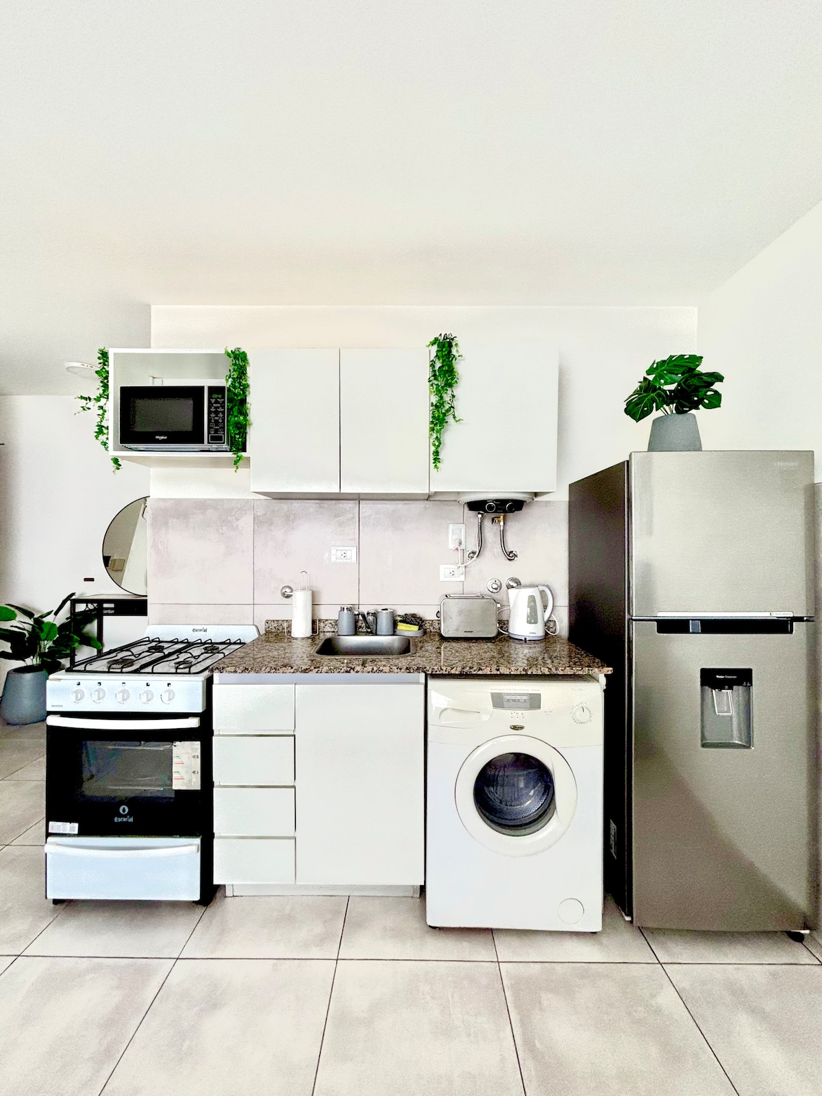 El alojamiento es un monoambiente muy luminoso y confortable, ventilación cruzada. El departamento se encuentra ubicado en el segundo piso se accede por escaleras. El mismo se encuentra en proceso de decoración especialmente para nuestros huéspedes y posee una cocina con amoblamientos amplios y muy completa (horno eléctrico, anafe eléctrico, cafetera, tostadora, heladera, pava elèctrica).