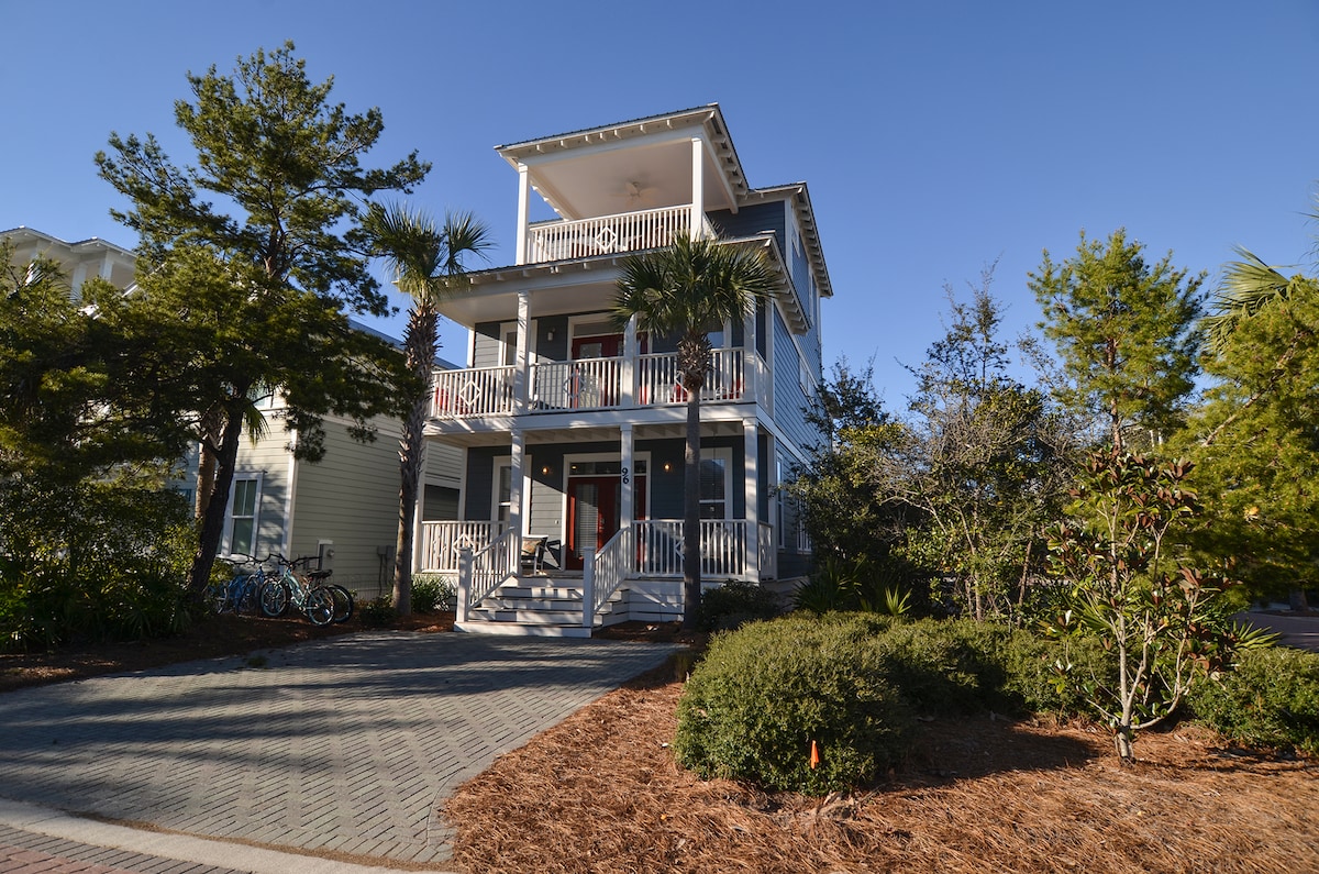Ubicada entre Rosemary y Alys Beach en 30A, justo enfrente del acceso privado a la playa (a 2 minutos a pie de la arena, ¡nunca más esperes el tranvía!) con la gran piscina de la laguna de Seacrest a solo unos pasos. Casa grande y espaciosa de 4 dormitorios y 4 baños con abundante luz solar natural y recientemente renovada con un diseño clásico de elegancia costera. Disfruta de vistas al mar, café al amanecer y cócteles al atardecer en la gran terraza al aire libre del tercer piso con cómodos asientos al aire libre y bar. ¡4 bicicletas gratuitas incluidas!