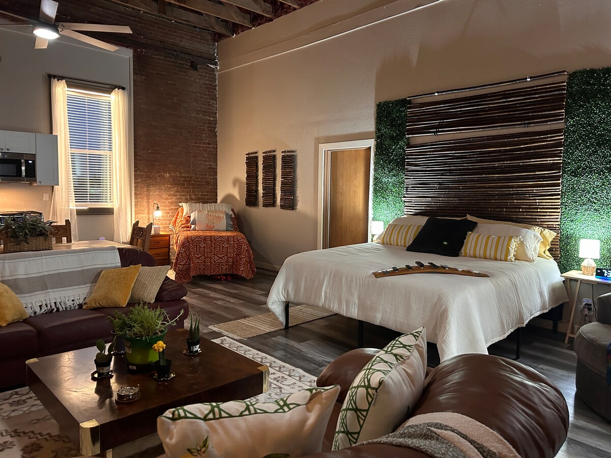 ¡Este loft único es el destino para cualquiera que busque una experiencia verdaderamente roswelliana! Un almacén del segundo piso en el corazón de Roswell fue remodelado para ofrecer a los huéspedes una escapada céntrica y exclusiva que nunca olvidarán. La cuidadosa atención a los detalles te hará sentir a gusto y una ubicación céntrica te permite caminar directamente al corazón de la ciudad. ¡Ven a relajar tus sentidos mientras creas recuerdos inolvidables aquí mismo en Roswell, Nuevo México!