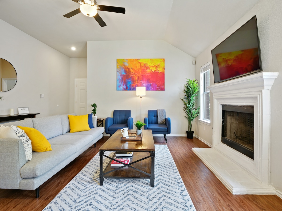 8 mins Drive to Domain. Smart, comfortably 3B2B home features beautiful new modern furniture, , 65" and 55" smart TV, blue tooth speaker built in ceiling fan, king size bed, walk in shower with rain shower head, smart décor with built in USB chargers, , a gorgeous covered patio, high speed google Fi WiFi, working desks with 24" monitor. The perfect place for families w/ kids or business people looking for the perfect home away from home.
