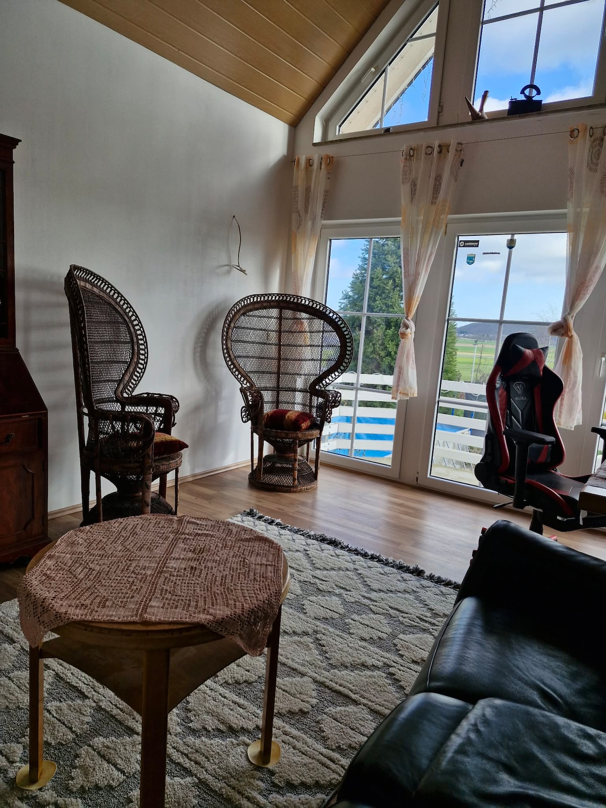 Traumhafte Dachwohnung (130 qm) im Herzen der Vulkaneifel, in Mehren/Daun. Idealer Standort für Wanderer/Radfahrer die Maare und den Eifelsteig zu entdecken, eine Oase zum Entspannen. Großzügiger Wohn-Essbereich führt in den herrlichen Wintergarten mit Kaminofen und auf die Terrasse mit bequemen Gartenmöbeln. Blick über Ort und Tal. Voll ausgestattete Küche. Beide Schlafzimmer mit Doppelbetten (160cm). Vom größeren Schlafzimmer Zugang zur Terrasse. Parken direkt am Haus. Kinder willkommen.