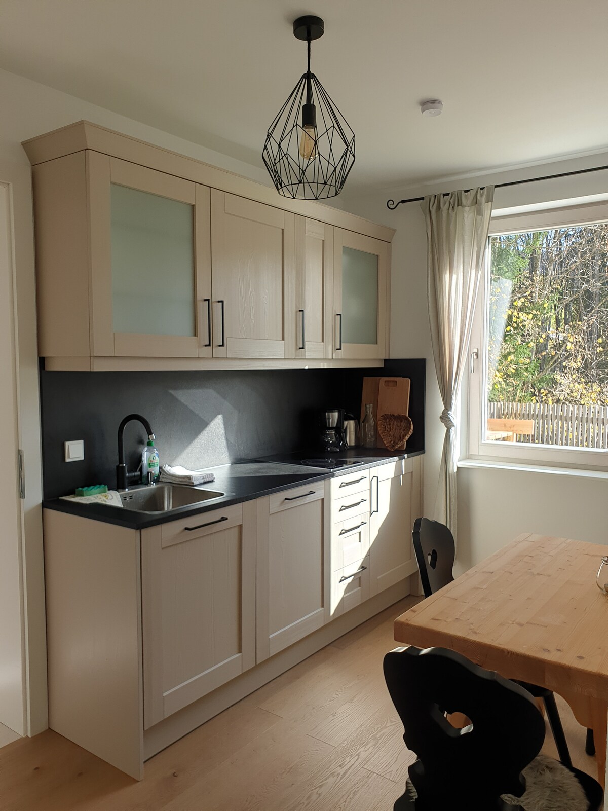 Nuestro apartamento está construido en 2016 y nos encantó diseñar las habitaciones, el equipamiento y la decoración. Se encuentra en la planta baja de nuestra casa y tiene una entrada independiente, una habitación adicional para esquís/botas de montaña, una entrada adicional y una conexión directa con la terraza y el jardín. El apartamento está totalmente equipado y la vista a las hermosas montañas que te rodean se puede disfrutar sentado en el sofá :) Solo tienes que probar y sentir la sensación "hogareña" en nuestra casa...