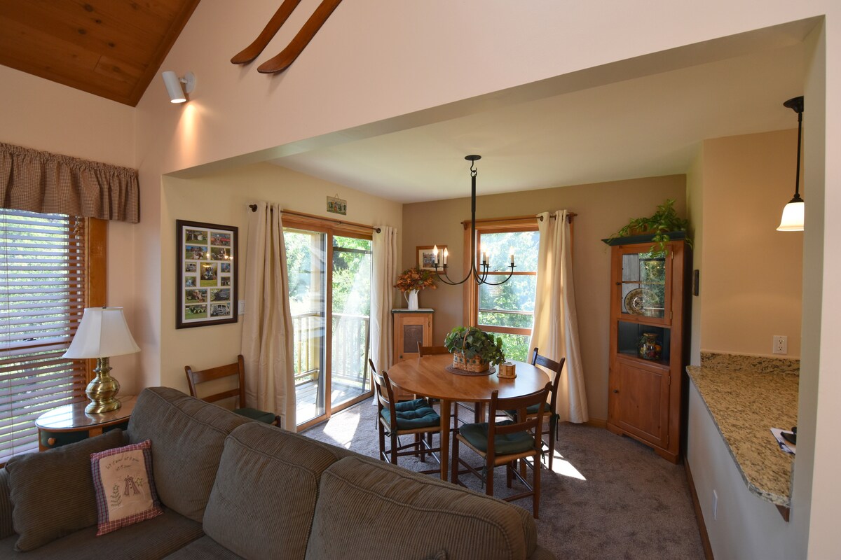 Acogedor apartamento de montaña Ski On-Ski Off con chimenea de madera real y cama tamaño king en Sunrise Village en la montaña Killington. Las actualizaciones incluyen todos los muebles nuevos en el dormitorio principal y el dormitorio de invitados, todos los electrodomésticos de acero inoxidable de primera línea nuevos en la cocina gourmet, sala de estar decorada con buen gusto con nuevo sofá cama tamaño queen y sillas a juego. Simplemente camina hasta el final del estacionamiento hasta la pista de esquí Ski On/Off. Soy dueño de la unidad contigua, más información a continuación.