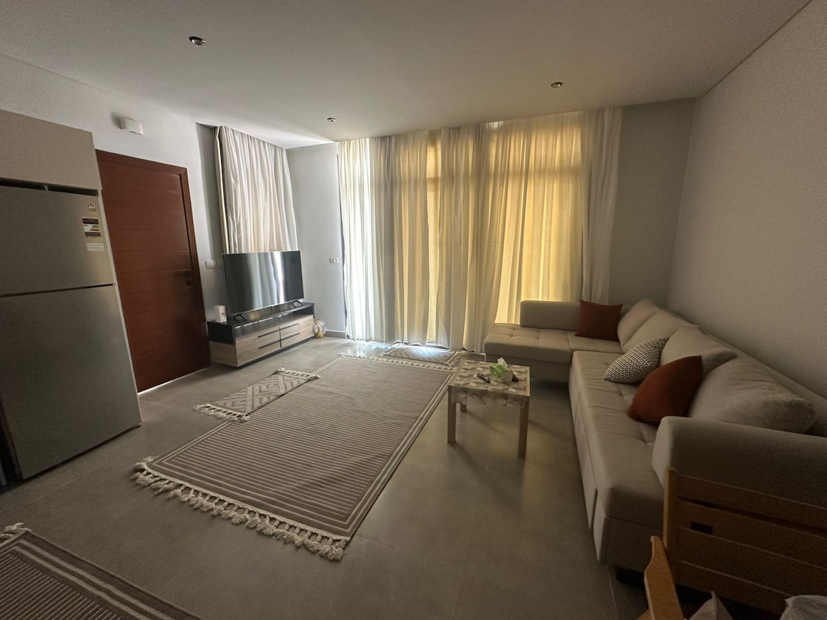 Apartamento moderno de estilo europeo con vistas al mar y a las montañas Todos los muebles están hechos a mano localmente. En la espaciosa terraza, puedes relajarte en las tumbonas y disfrutar de la vista panorámica del mar. El gran dormitorio con fantásticas vistas a las majestuosas montañas del desierto de Safaga ofrece mucho espacio y tranquilidad. La cocina está equipada con electrodomésticos de alta calidad. La amplia sala de estar con un sofá cama extraíble también ofrece vistas al mar.