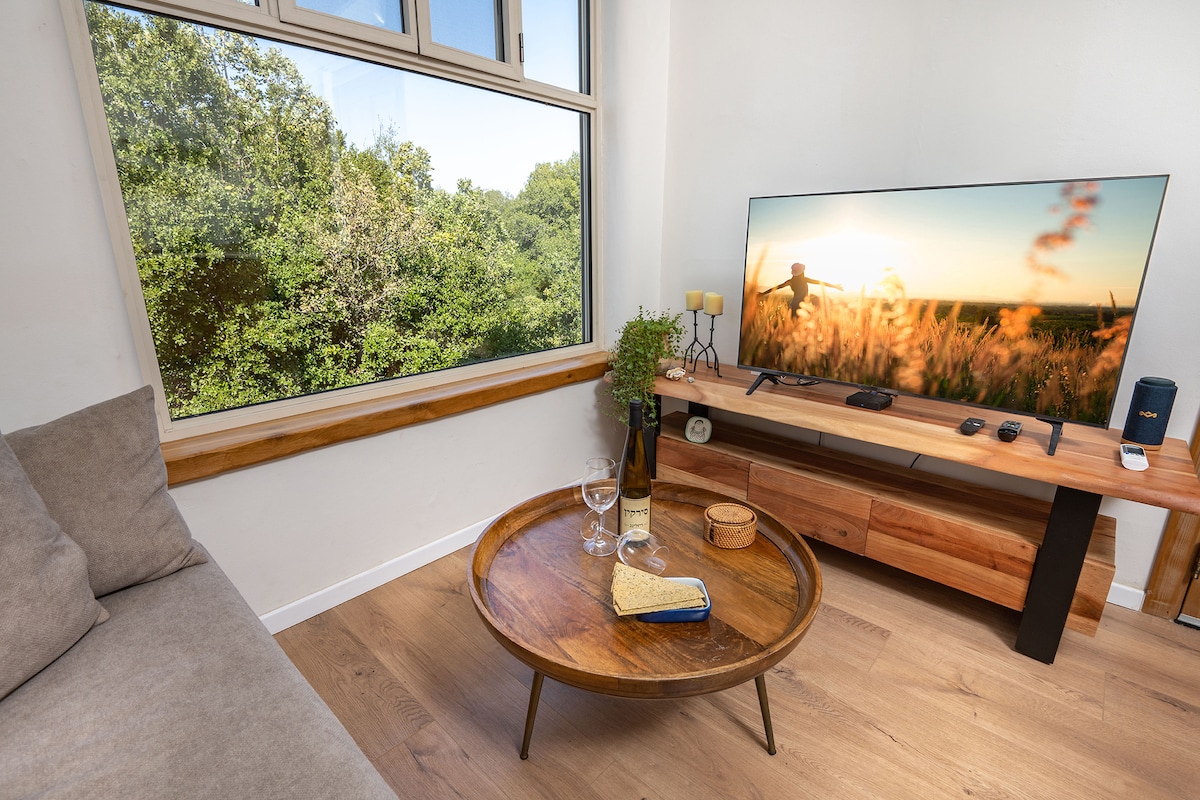 Despiértate con vistas a las copas de los árboles en nuestra romántica casa de huéspedes para parejas. Rodeado de naturaleza, con enormes ventanas, balcón privado, cocina completa y un diseño cuidado. Perfecto para relajarse, explorar o quedarse en casa. Paseos por el bosque, impresionantes puestas de sol en Galilea y total privacidad te esperan. Limpieza y comodidad excepcionales en el interior. Consejos locales excepcionales disponibles de un superanfitrión que realmente se preocupa. ★ «Impecable, mágico, más allá de las expectativas: ¡el mejor Airbnb en el que nos hemos alojado! Perfecto para parejas y amantes de la naturaleza»