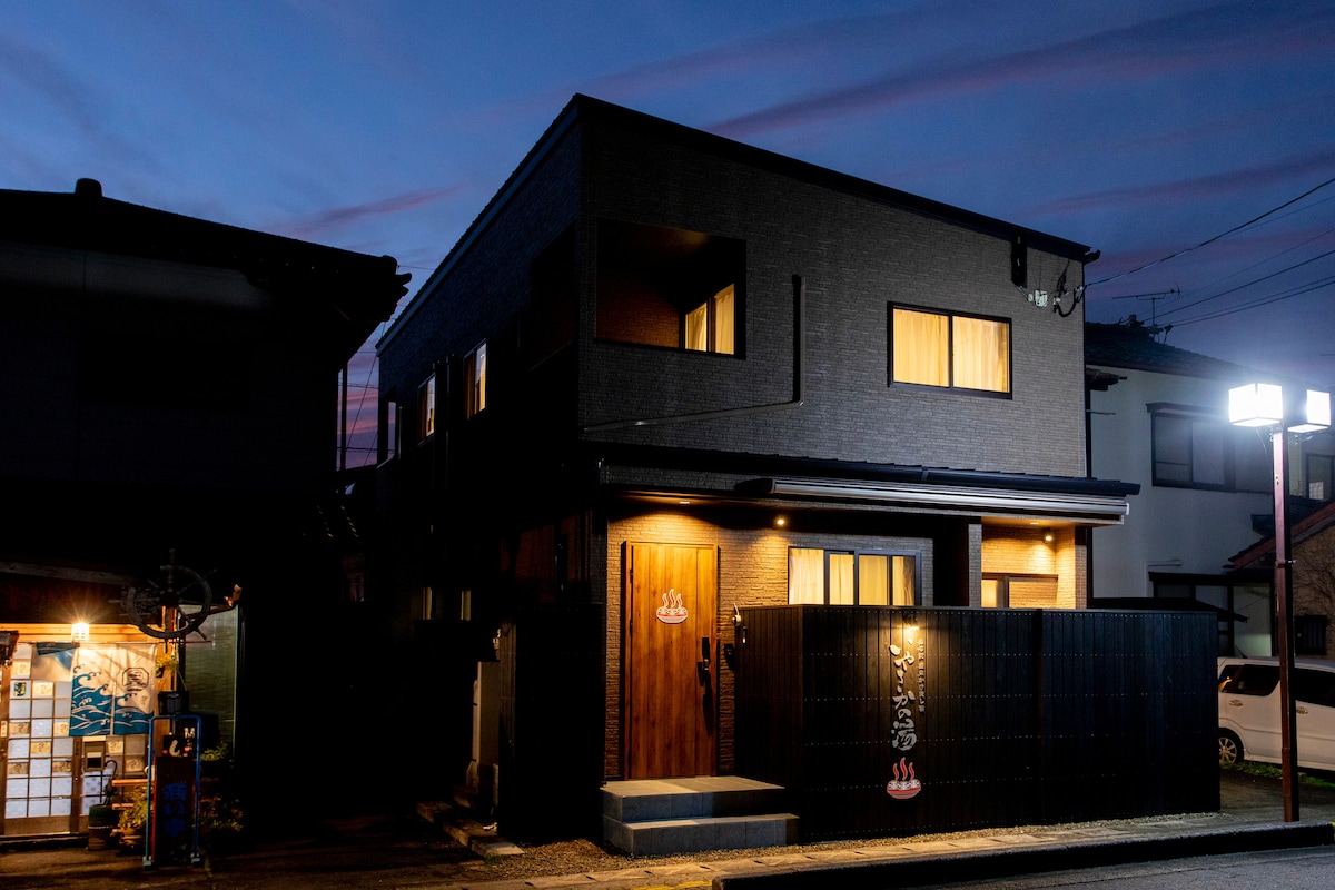 Located 30-second walk from Yufuin Station and a 1-minute walk from Yufuin Bus Station. It’s a new two-story house completed in April, 2022. Max 6 people can stay and has large outdoor private Onsen. 1F – Private Onsen, living room, kitchen, bathroom, toilet 2F - 1 bedroom (1 queen size bed), 2 bedroom (2 queen size bed) There are wash basins and toilets in each room. FREE high-speed wifi. For parties of 2 or fewer,you may choose between 2 queens or 1 queen to be prepared.