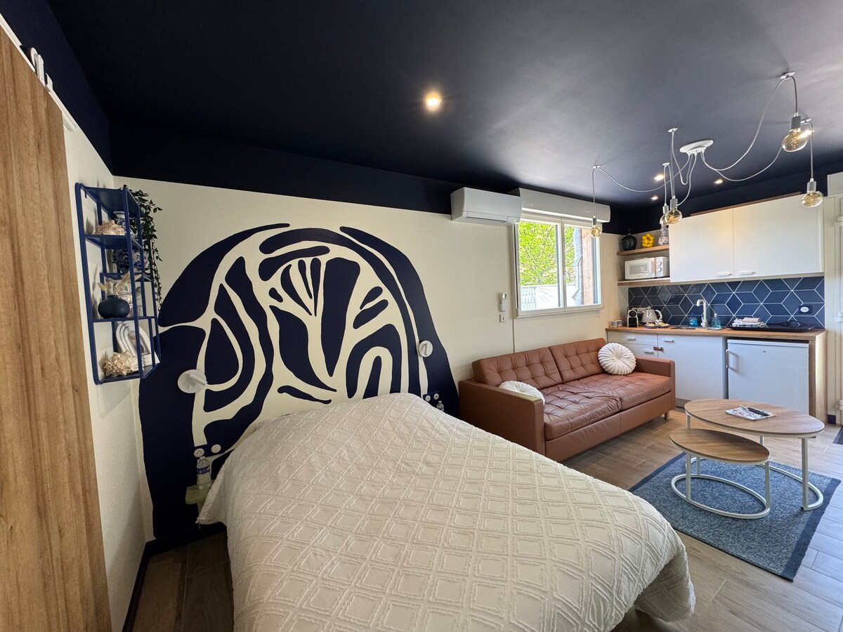 Relájese en este alojamiento tranquilo y elegante. Televisión acceso gratuito a Netflix, wifi, café, té, cuarto de baño. Una cama de 140x190 Este alojamiento le sumergirá en un universo mediterráneo con toques azules y blancos La llegada se realiza a partir de las 16:00 de forma autónoma con caja de código o por recepción física y la salida es a las 12:00.