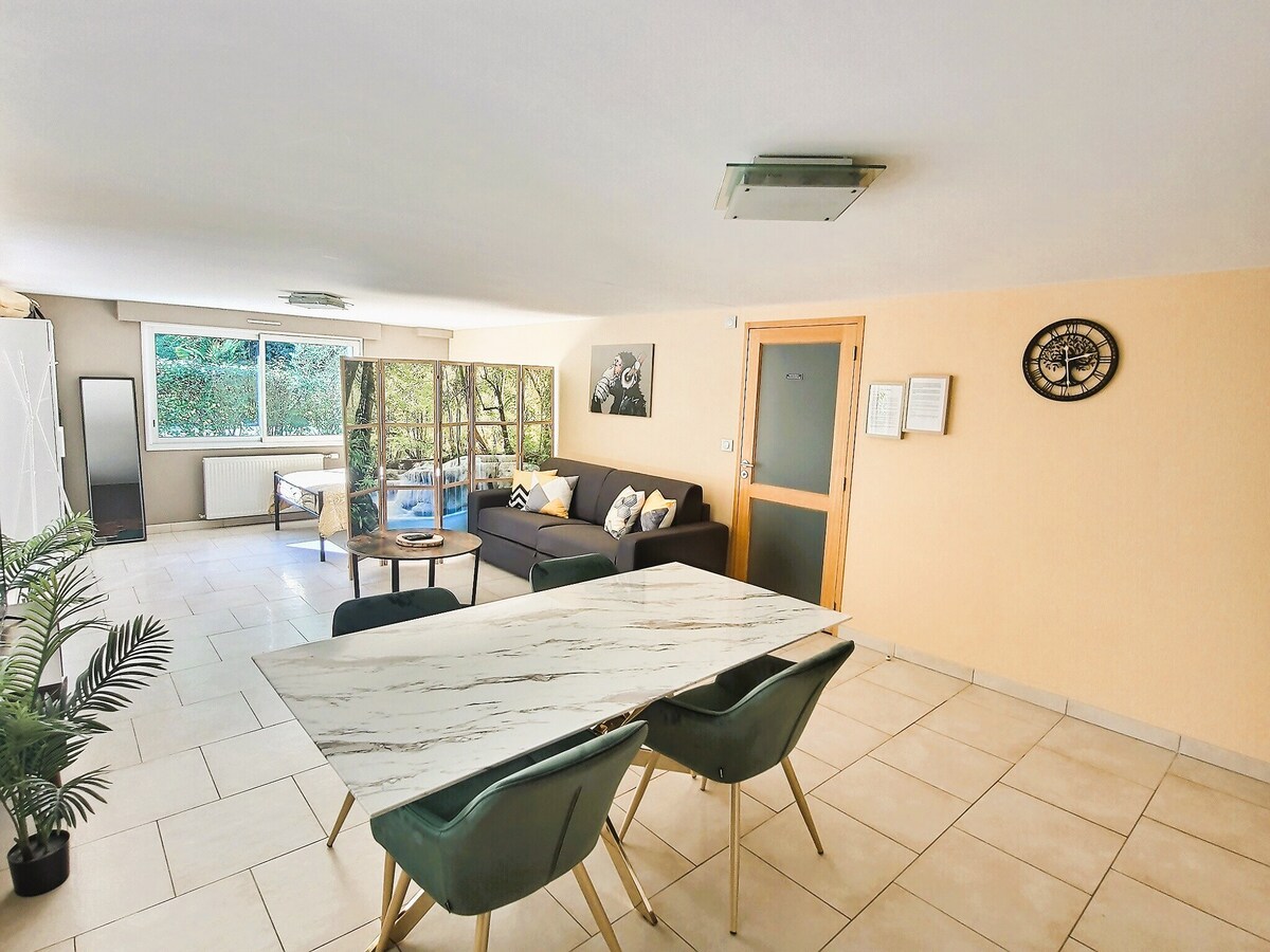 Bienvenido a este encantador estudio independiente, bañado por la luz y totalmente equipado, situado en la planta baja de nuestra casa en Saint Aignan. Con una ubicación ideal entre Nantes y el mar, este luminoso estudio puede alojar hasta 4 personas + un niño menor de 4 años gratis. Disfrute de una agradable vista de un exuberante jardín, rodeado de palmeras, un platanero y viñedos. Este lugar es ideal para unas vacaciones memorables o para reponer energía después de una jornada de trabajo.