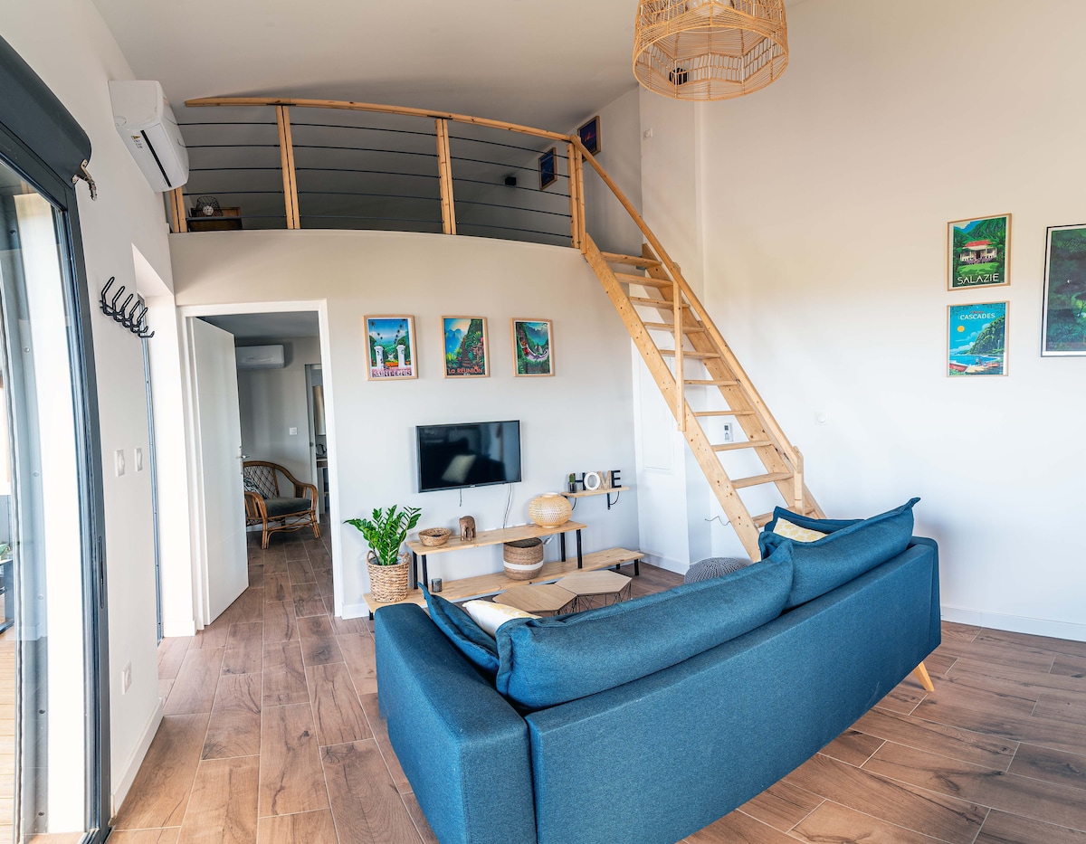 Situado en una urbanización dentro de una zona natural protegida, Sweet Moka le da la bienvenida con los siguientes objetivos: bienestar y relajación. Disfrutará de un apartamento de 32 m² con todas las comodidades con un dormitorio, un altillo, una sala de estar-cocina abierta, un exterior de 60 m² con jacuzzi de 5 plazas y terraza... Todo con vistas al mar y a la montaña, tranquilo. Lo más destacado: un gimnasio en casa con equipamiento profesional. La ubicación es ideal: a 10 minutos del aeropuerto, a 5 minutos de los servicios y a 20 minutos de Saint Denis.