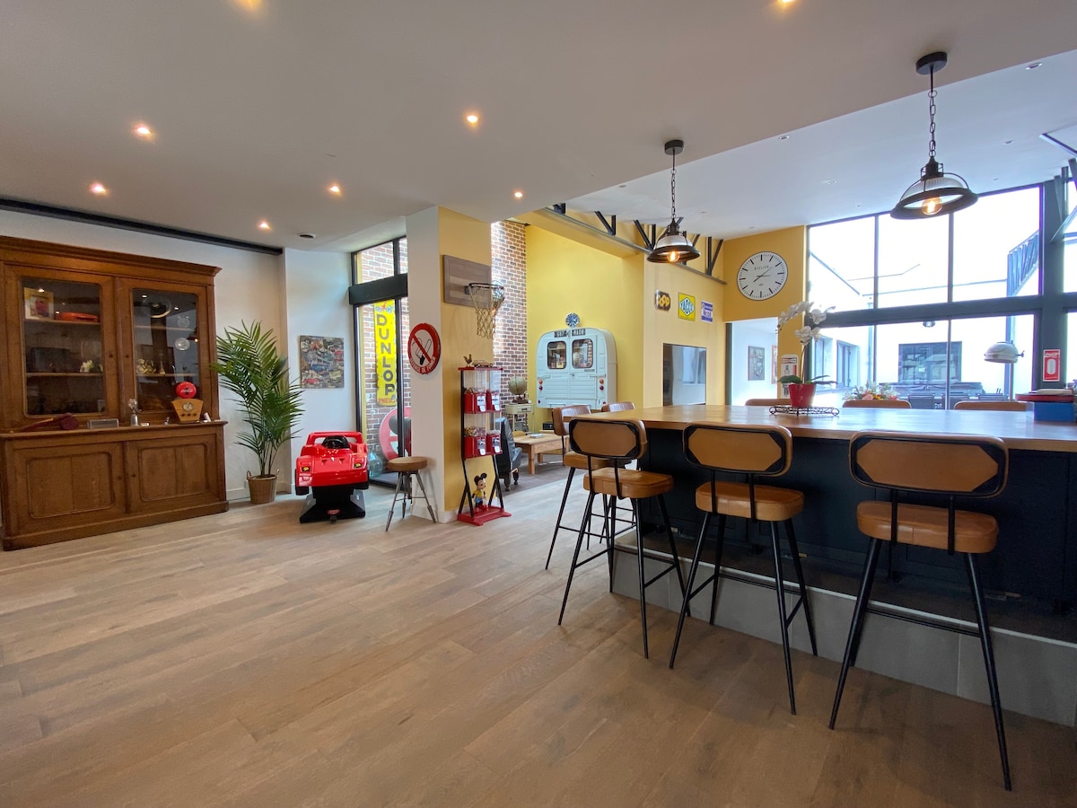 Relájese en el w w w . loft-spa-reims . es, 250 m2 privados y estacionamiento. Spa EXTERIOR sin vecinos enfrente, piscina cubierta climatizada. Un dormitorio cama king size, vestidor y baño con ducha. Dos habitaciones con cama de 160 x 200, baño privado con ducha. ¡Flipper, futbolín, jukebox, para compartir buenos momentos con el amigo(a)s o en familia! ¡NO SE permiten fiestas! Prohibido recibir a personas no previstas en la reserva, una cámara filma la entrada exterior del Loft. Actividades ilegales prohibidas.